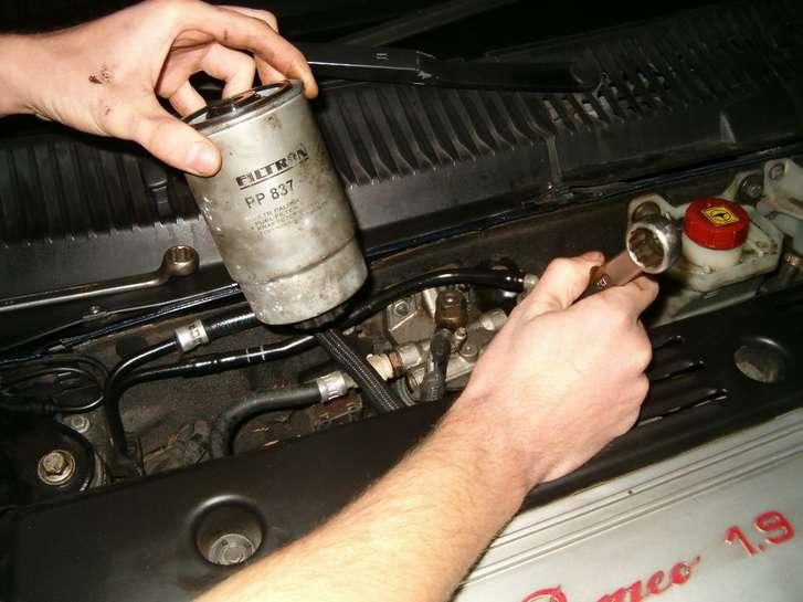 Wymiana filtrów paliwa w silnikach benzynowych jest stosunkowo prosta i polega na odłączeniu ich od przewodów do nich dochodzących. Ale uwaga! Należy przyjrzeć się jak są one zamontowane, aby po założeniu nowego filtra zastosować takie same uszczelki i zamocowania. Wśród tych ostatnich najczęściej występują podłączenia wtykane i zaciskowe (opaskowe). Tzw. uniwersalne opaski można też kupić na stacjach benzynowych lub w niektórych marketach budowlanych: fachowcy przestrzegają jednak przed stosowaniem takich opasek, ze względu na ich niską jakość. Po właściwym zamontowaniu nowego filtra należy odpowietrzyć układ wtryskowy. Dokonuje się tego przez specjalny odpowietrznik (jest on na listwie paliwowej łączącej wtryskiwacze). Należy kilkakrotnie włączyć i wyłączyć zapłon, wciskając jednocześnie iglicę zaworka odpowietrznika do momentu zauważenia wypływu paliwa z układu wtryskowego. Na koniec sprawdza się (po ponownym uruchomieniu silnika), czy w wypuszczanej benzynie nie ma pęcherzyków powietrza. Jeśli są, należy powtórzyć całą procedurę odpowietrzania.