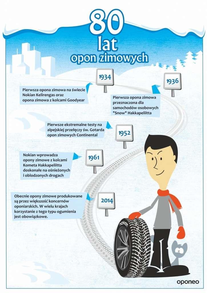 Jednak idea opony zimowej ma raptem 80 lat. Na pomysł stworzenia tego typu ogumienia wpadła fińska firma Nokian Tyres. W Skandynawii warunki pogodowe zimą są bardzo ciężkie i kierowcy często mieli problemy z poruszaniem się po drogach. Dotyczyło to przede wszystkim kierowców aut ciężarowych, którzy przed większymi podjazdami musieli zatrzymywać samochód i zakładać łańcuchy zimowe. Dlatego też w 1934 roku fiński producent wprowadził do sprzedaży pierwszą oponę zimową dedykowaną samochodom ciężarowym – Nokian Kelirengas. W tym samym roku w ofercie Goodyeara pojawiła się opona zimowa z kolcami.