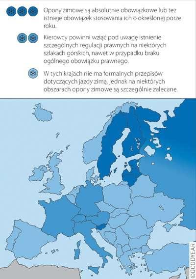Przepisy dotyczące opon zimowych znacznie różnią się w krajach europejskich. Coraz więcej państw zdaje sobie sprawę z wymiernych korzyści płynących z ich stosowania w zakresie zwiększenia bezpieczeństwa. Niektóre rządy już wprowadziły obowiązek montowania „zimówek", inne zastanawiają się nad zmianą swojego ustawodawstwa w tym zakresie.