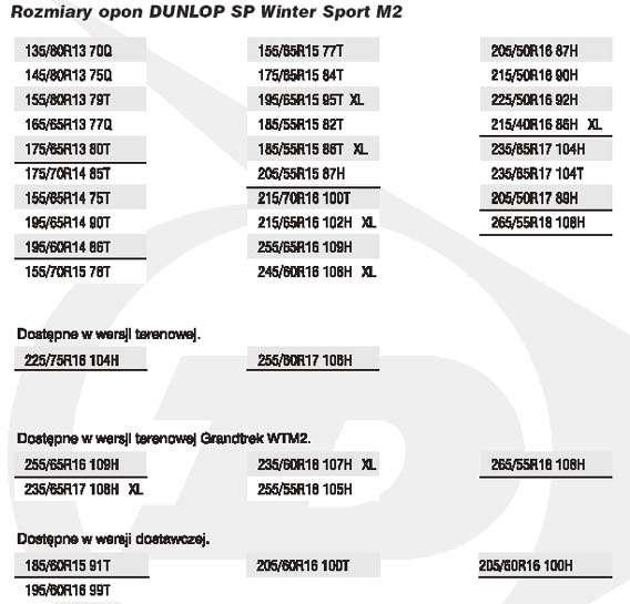 oferowana jest aż w 89 rozmiarach na koła o średnicach od 13 do 19 cali z indeksami prędkości od T do V (240 km na godzinę), co w pełni uzasadnia słowo „Sport“ występujące w nazwie. Agresywny, sportowy wygląd opony sprawia, że doskonale nadaje się do tuningu.Na DUNLOP SP Winter Sport M3