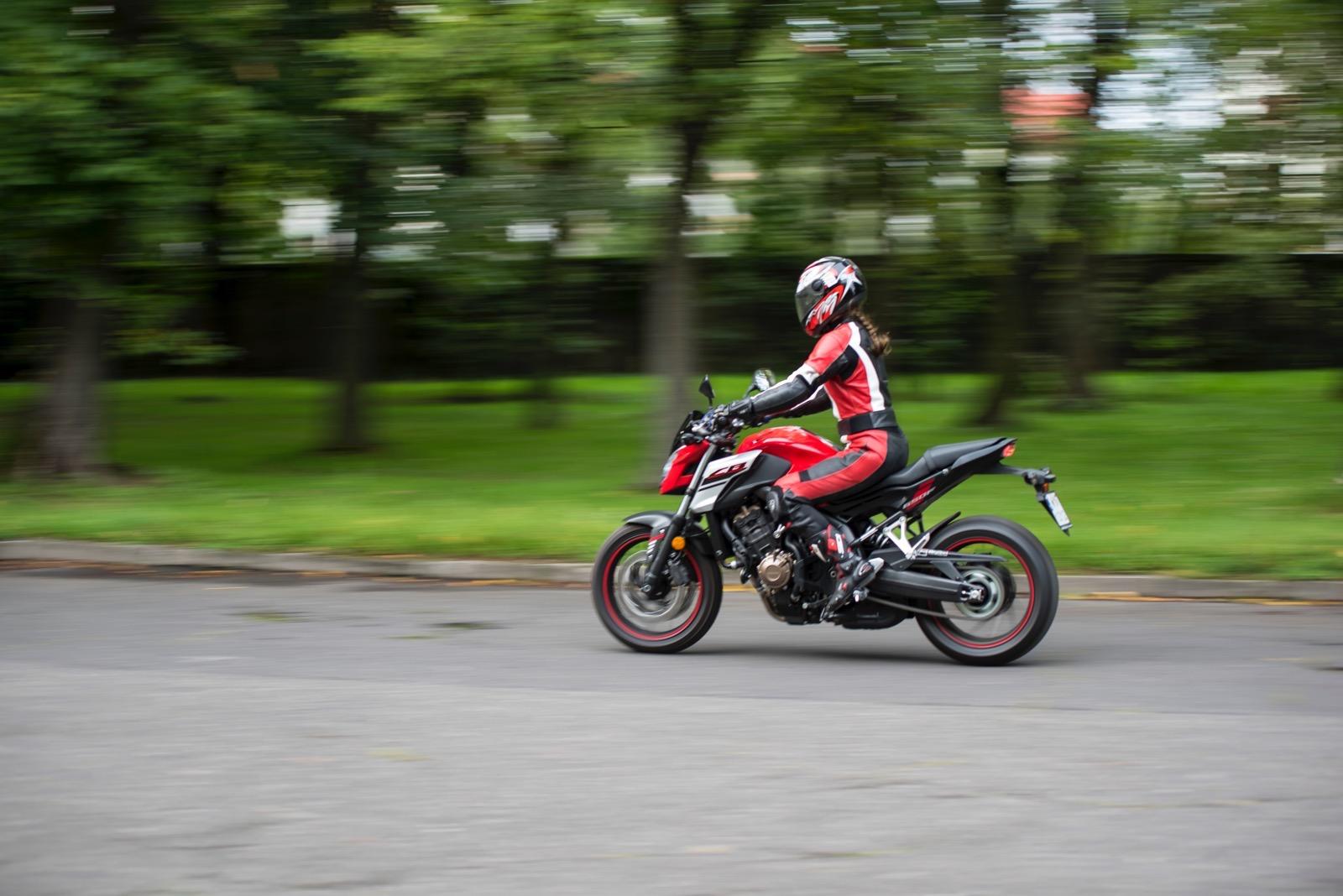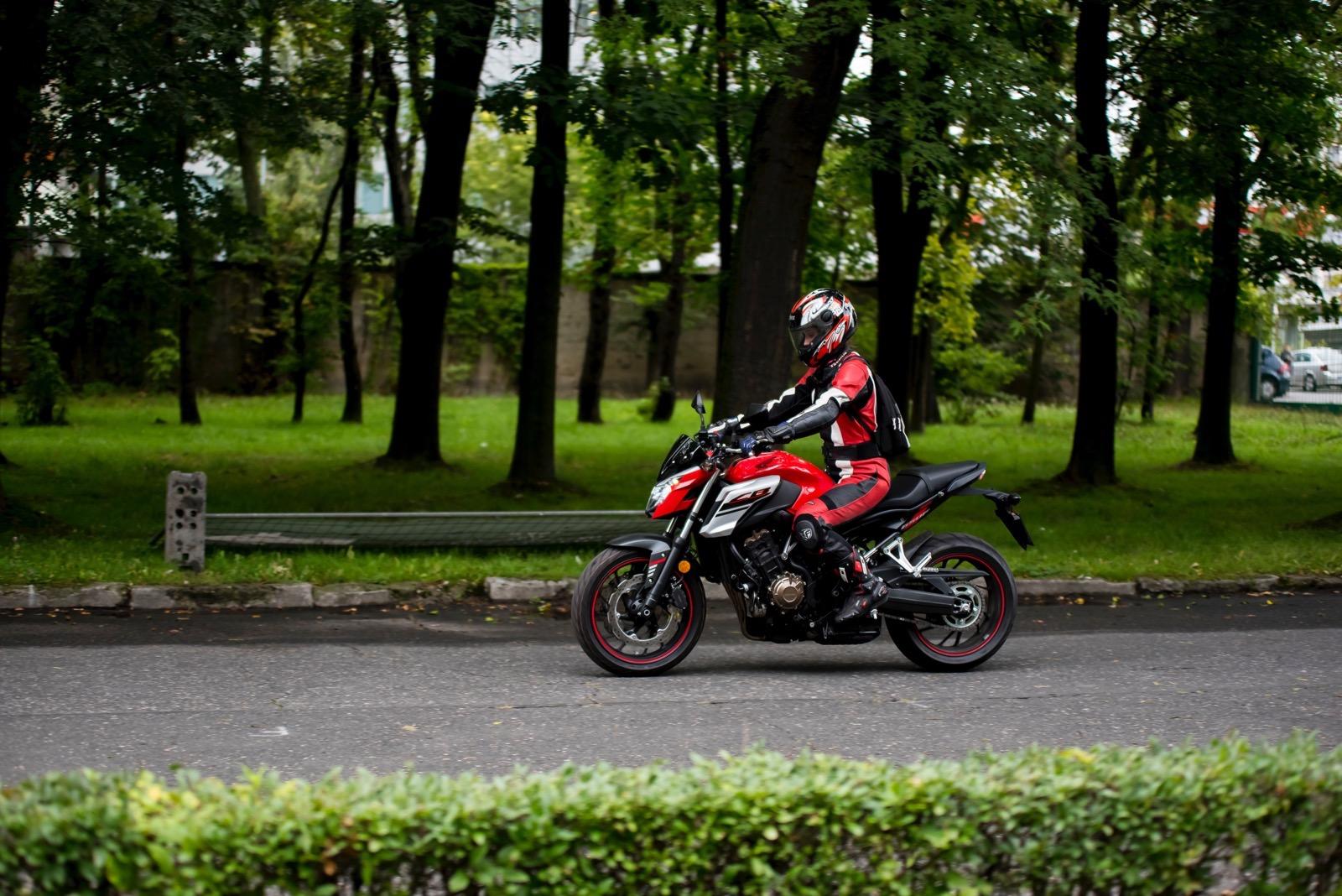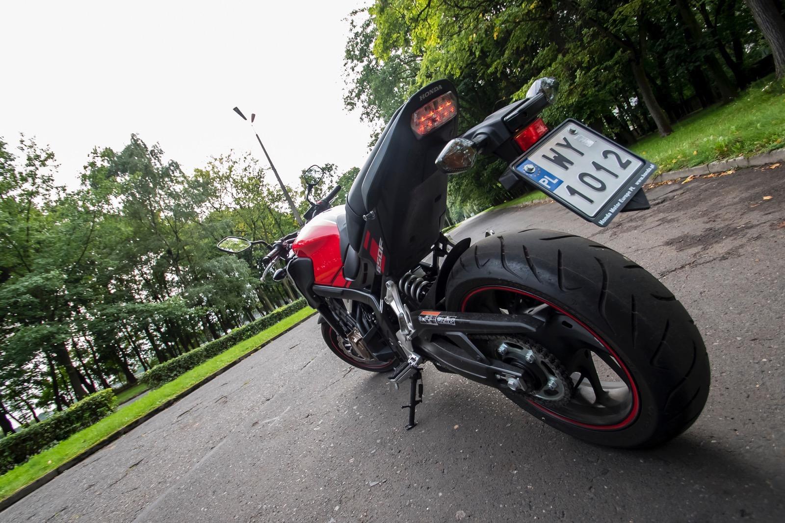 Honda CB650F bardzo płynnie oddaje moc. Dynamiczne przyspieszenie jest możliwe w niemal pełnym zakresie obrotów. Nawet gdy jedziemy na szóstym biegu, a obrotomierz wskazuje leniwe 1,5 tysiąca, wystarczy zdecydowany ruch prawego nadgarstka, by natychmiast obudzić drzemiący w Hondzie potencjał. Jej zapał do przyspieszania w każdych okolicznościach sprawia jednak nieznaczne problemy podczas manewrowania lub jazdy w korku. Wówczas nawet minimalny ruch manetką skutkuje wyrwaniem do przodu. Nawet tocząc się w korku niemal bez gazu czuć, że motocykl stale „ciągnie” do przodu. Czasem konieczna jest nawet jazda na półsprzęgle. Jednak wypuszczając CB650F na otwartą przestrzeń, widać że maszyna lubi oddychać. A ma czym. Dodatkowe kilka koni mechanicznych udało się uzyskać przez modernizację układu przepływu powietrza przez dolot, a spalin przez układ wydechowy. W tym pierwszym skrócono kanały ssące, które dostarczają powietrze do czterech przepustnic o średnicy 32 mm. Dodatkowo w tłumiku znajdują się teraz dwie (a nie jak wcześniej – trzy) komory wewnętrzne, co pozwoliło obniżyć ciśnienie zwrotne. Zwiększono także otwór końcowy, co ułatwia wylot spalin.