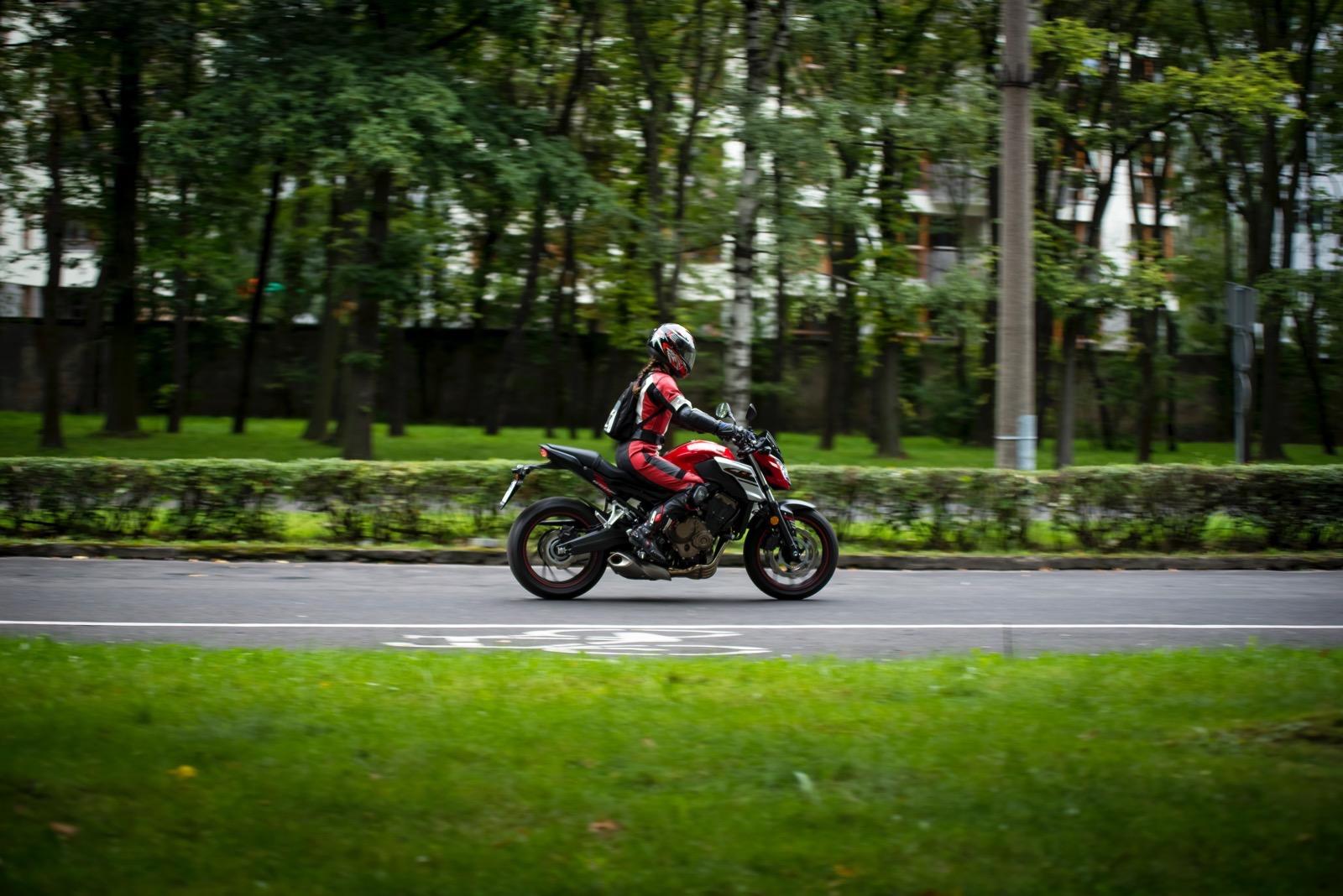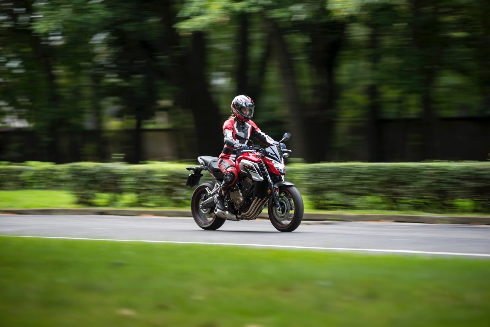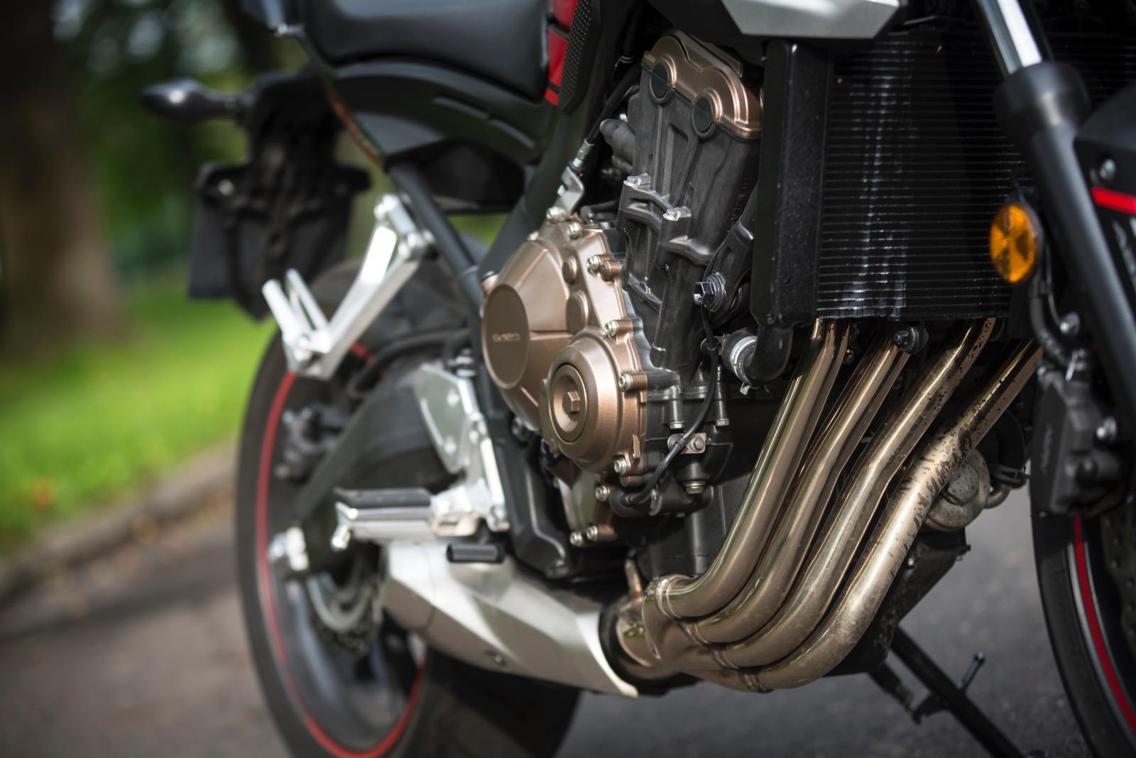 Honda CB650F bardzo płynnie oddaje moc. Dynamiczne przyspieszenie jest możliwe w niemal pełnym zakresie obrotów. Nawet gdy jedziemy na szóstym biegu, a obrotomierz wskazuje leniwe 1,5 tysiąca, wystarczy zdecydowany ruch prawego nadgarstka, by natychmiast obudzić drzemiący w Hondzie potencjał. Jej zapał do przyspieszania w każdych okolicznościach sprawia jednak nieznaczne problemy podczas manewrowania lub jazdy w korku. Wówczas nawet minimalny ruch manetką skutkuje wyrwaniem do przodu. Nawet tocząc się w korku niemal bez gazu czuć, że motocykl stale „ciągnie” do przodu. Czasem konieczna jest nawet jazda na półsprzęgle. Jednak wypuszczając CB650F na otwartą przestrzeń, widać że maszyna lubi oddychać. A ma czym. Dodatkowe kilka koni mechanicznych udało się uzyskać przez modernizację układu przepływu powietrza przez dolot, a spalin przez układ wydechowy. W tym pierwszym skrócono kanały ssące, które dostarczają powietrze do czterech przepustnic o średnicy 32 mm. Dodatkowo w tłumiku znajdują się teraz dwie (a nie jak wcześniej – trzy) komory wewnętrzne, co pozwoliło obniżyć ciśnienie zwrotne. Zwiększono także otwór końcowy, co ułatwia wylot spalin.