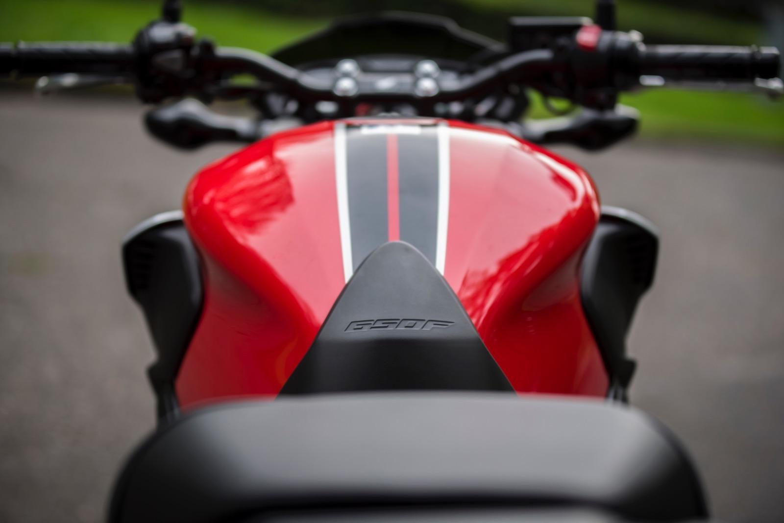 Nowa Honda CB650F pod niektórymi względami została ugłaskana, a pod innymi – wyostrzona. Nadal mamy cztery złote kolektory wydechowe, schodzące się w jeden krótki tłumik, kończący się tuż pod prawym podnóżkiem. To bardzo estetyczny trend, aby nie wyciągać już układów wydechowych daleko za podnóżek pasażera. Zakończenie tłumika w zasadzie tuż pod silnikiem nadaje motocyklowi masywności i potęguje wrażenie zwartej sylwetki. Do złotych kolektorów wydechowych świetnie pasują pokrywy silnika, również w złoto-miedzianym odcieniu. Całość ubrano w czerwono-czarno-srebrne barwy lakieru.