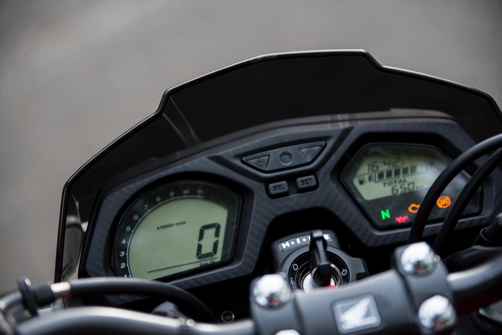 Zegary w Hondzie CB650F są jasne i przejrzyste. Na lewym ekranie zobaczymy obrotomierz i prędkościomierz. Prawy to cyfrowy wskaźnik poziomu paliwa, przebiegu, zegar oraz kontrolki ostrzegawcze. Całość jest przejrzysta i nie przytłacza nadmiarem informacji.