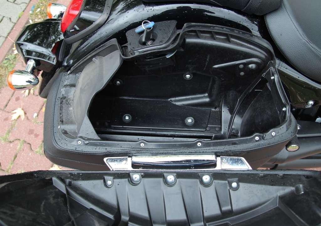 Fabrycznym wyposażeniem są podesty, rozbudowana szyba oraz boczne kufry. Suzuki z dumą podkreśla, że motocykl już w fabrycznym wydaniu nadaje się do turystycznych eskapad. Najmocniejszy punkt programu stanowią zintegrowane kufry. Fakt, nie mają rekordowej pojemności. Zostały jednak tak wyprofilowane, by nie ograniczać pasażerowi swobody ruchu oraz nie wystawać poza obrys motocykla – jeżeli w luce między samochodami mieszczą się lusterka, podesty i kierownica – przejadą także kufry. Co ważne, nie zmuszają do wożenia ze sobą pęku kluczy. Otwieramy je kluczykiem pasującym także do stacyjki.