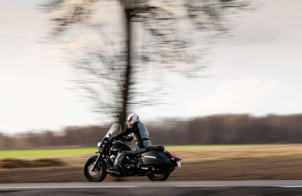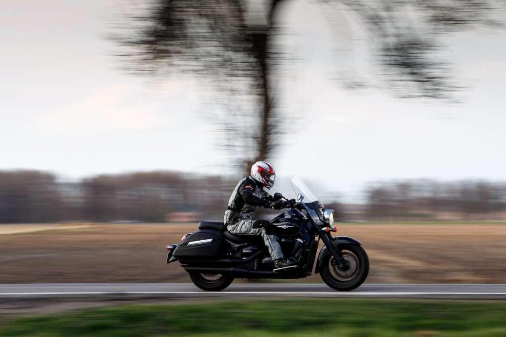 Masywny, przyciężki wręcz Intruder z ogromną szybą czołową i bardzo szeroką kierownicą wygląda na swoje 363 kg masy własnej. W wielu motocyklach o liczbie kilogramów można zapomnieć tuż po ruszeniu. Wprawiony w ruch sprzęt staje się zwinny i chętnie łamie się do zakrętów. W Intruderze sprawy mają się inaczej. Parkingowe manewry wymagają skupienia. Sterowane linką sprzęgło działa ciężko, dźwignią skrzyni biegów należy operować zdecydowanie, V2 nie przepada za niskimi obrotami, a przechylające się na bok kilogramy potrafią zaskoczyć. Na szczęście siodło znajduje się 720 mm od asfaltu – w krytycznej sytuacji nawet osoba o przeciętnym wzroście będzie mogła podeprzeć się nogą.