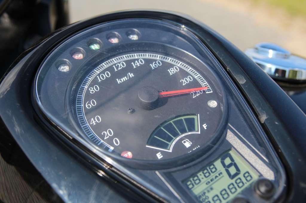 Na szczycie zbiornika paliwa znalazł się zestaw wskaźników. Poza ogromnym prędkościomierzem mamy do dyspozycji kontrolki kierunkowskazów, biegu jałowego, świateł drogowych, temperatury silnika i ciśnienia oleju, jak również ciekłokrystaliczne wyświetlacze wybranego biegu, czasu, przebiegu (dziennego i całkowitego) oraz poziomu paliwa. Cyfrowy wskaźnik poziomu paliwa jest mało precyzyjny. Zdarza się, że jedno z pól gaśnie po dłuższym postoju czy podczas jazdy po nachylonej drodze, by kilka minut później ponownie rozbłysnąć.