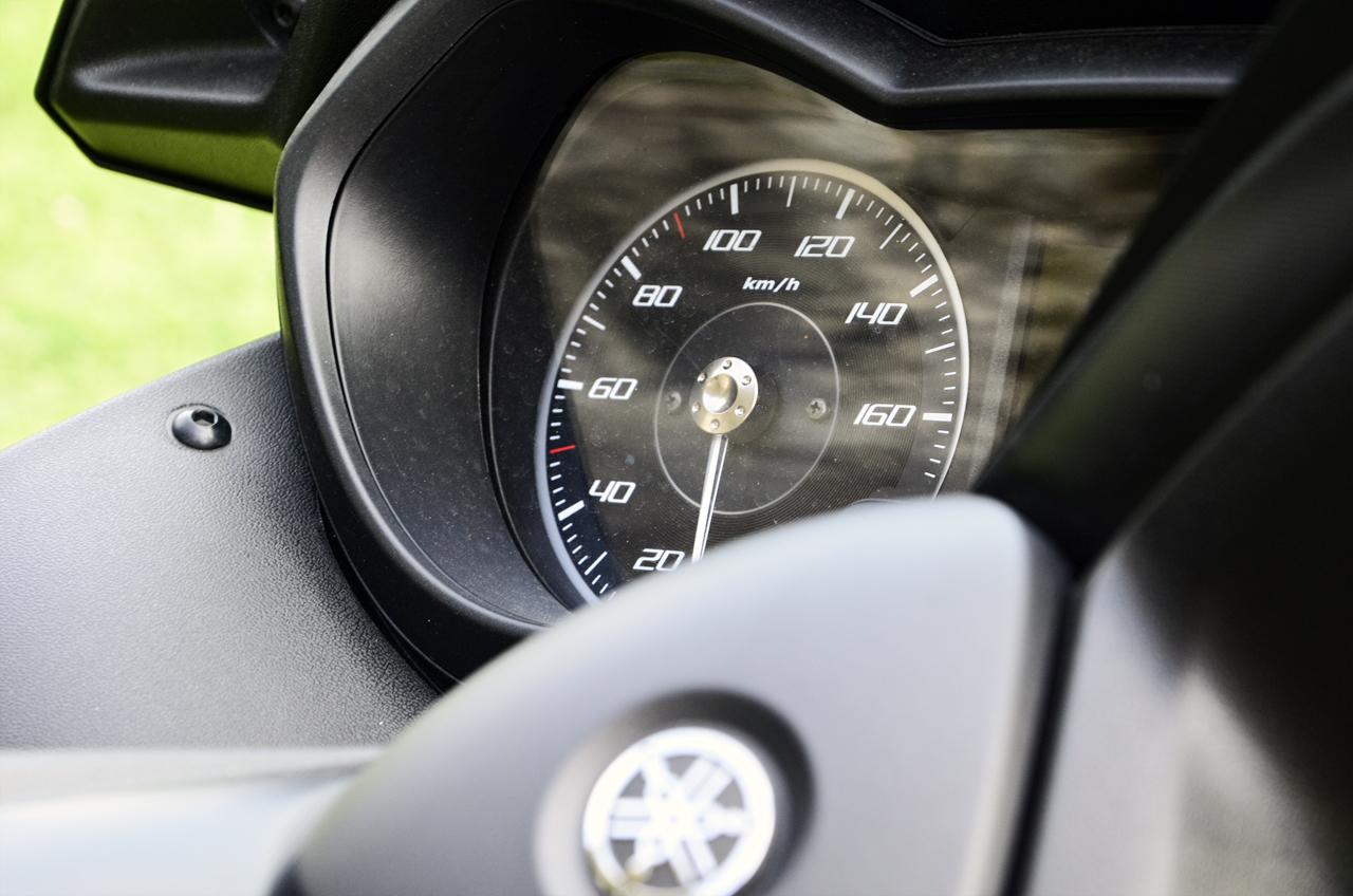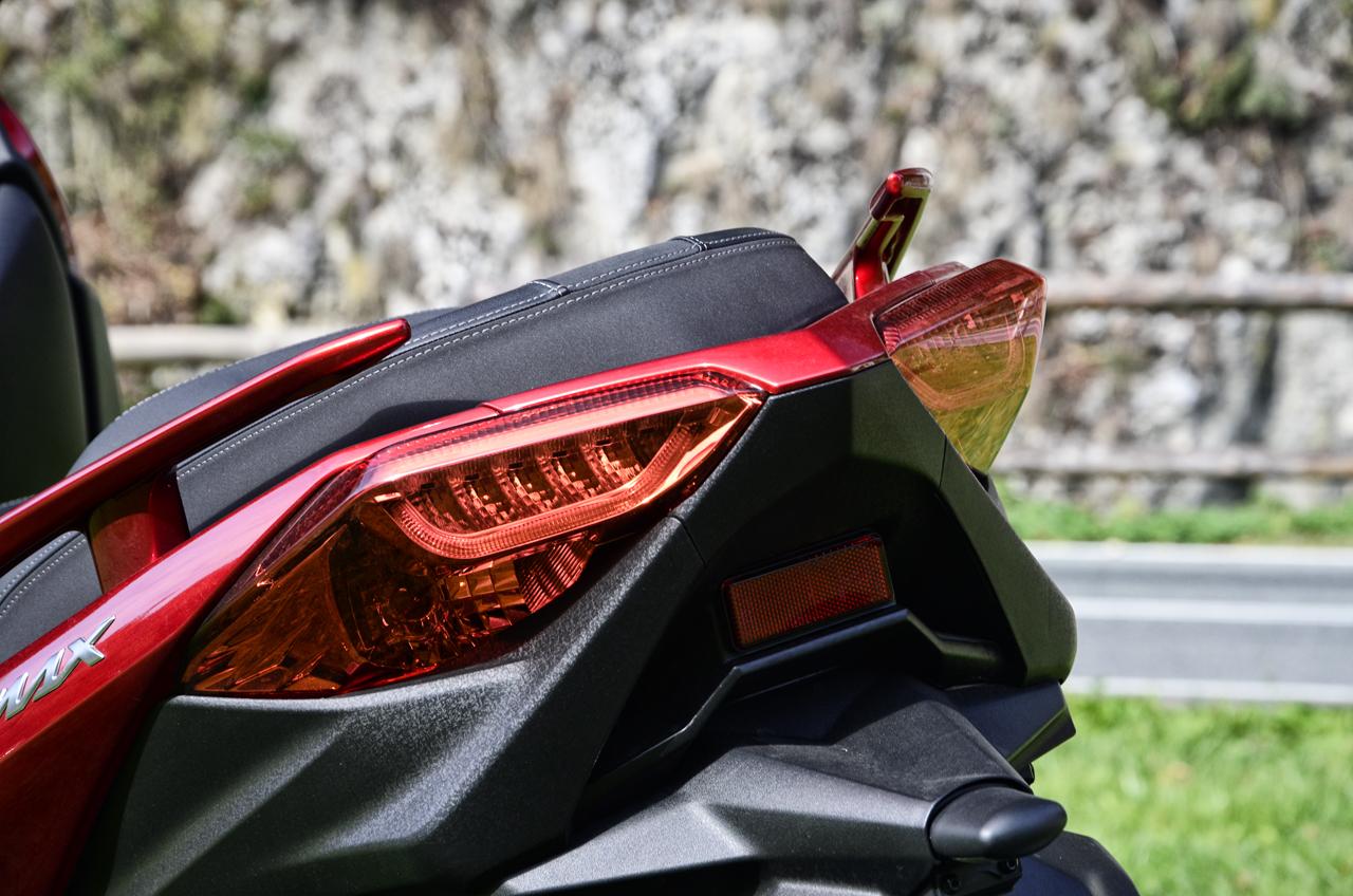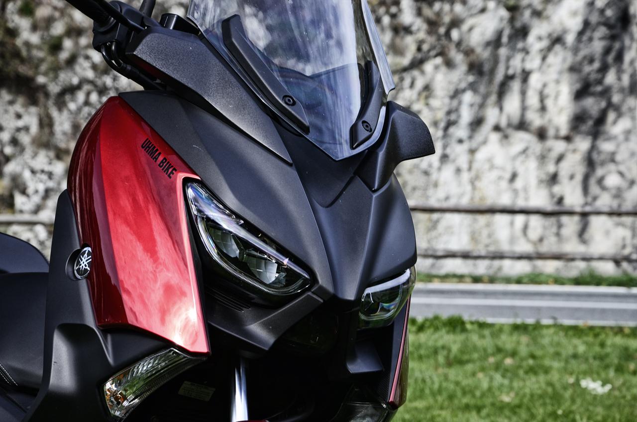 Pierwsze wrażenie jest bardzo dobre. Sylwetka Yamahy już z daleka zwraca na siebie uwagę. Swój dostojny, ale przy tym dynamiczny wygląd, skuter zawdzięcza przede wszystkim agresywnie zaprojektowanym przednim reflektorom, które, co warto zaznaczyć, wykonane są w całości w technologi LED. Tył skutera również nie należy do nudnych. Sporych rozmiarów kanapa bez problemu pomieści dwie dorosłe osoby, a aluminiowe wstawki i gustowne przeszycia pokazują, że nie mamy do czynienia z maszyną z hipermarketu.