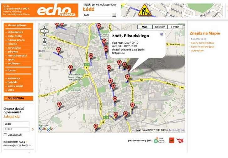 Na siedmiu lokalnych podserwisach odpowiadających miastom, w których ukazuje się Echo (Warszawa, Łódź, Poznań, Wrocław, Kraków, Trójmiasto, aglomeracja śląska) znajdują się mapy, które obrazują sytuację na drogach w mieście. Każdy zaznaczony na mapie remont uzupełniony jest informacją o powstałej blokadzie lub zamkniętym pasie ruchu, dacie rozpoczęcia i zakończenia modernizacji oraz zakresie prowadzonych robót. Mapy (powstałe w systemie mash-up, w oparciu o mapy google’a) są bardzo proste w obsłudze i stale aktualizowane.