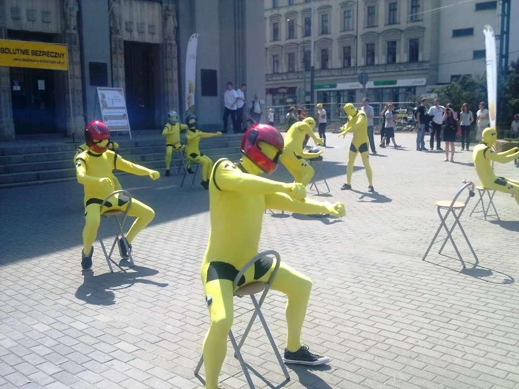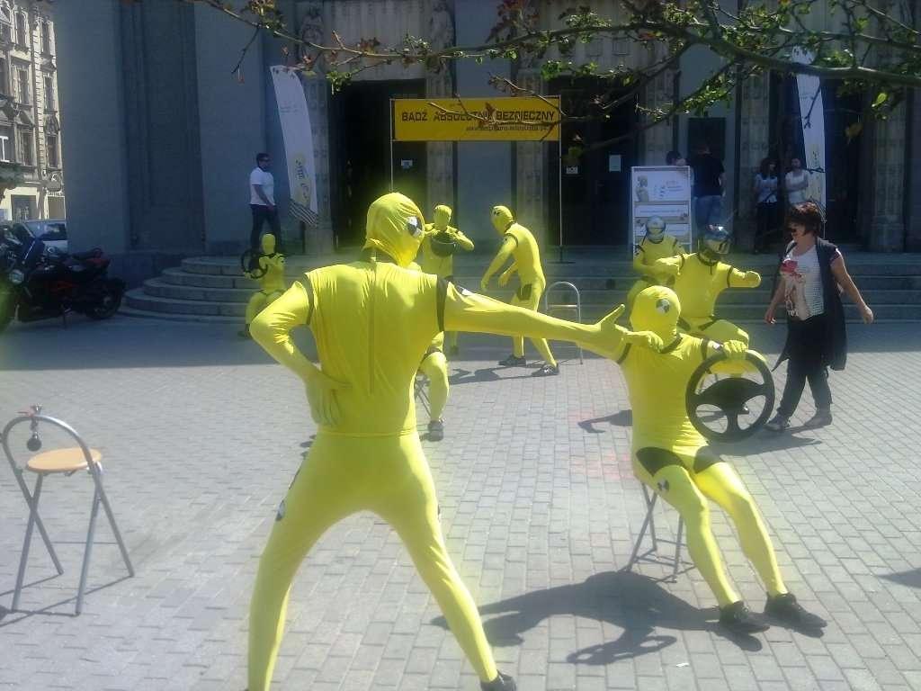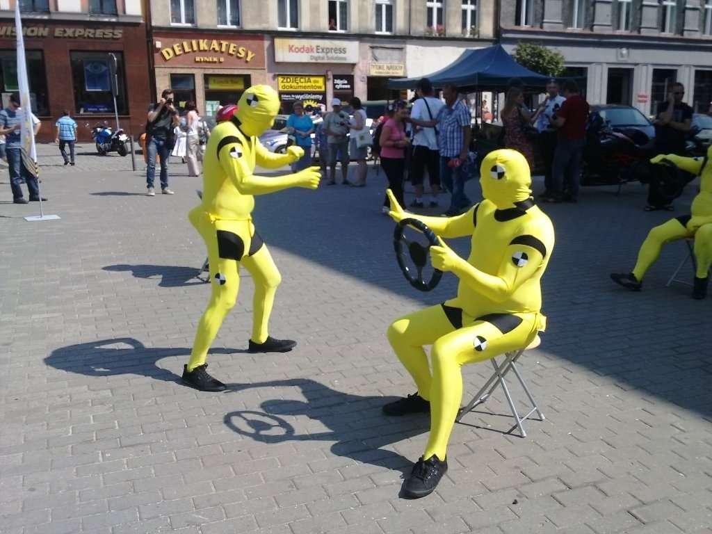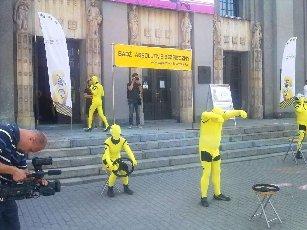 Podczas happeningu przed Teatrem im. Stanisława Wyspiańskiego w Katowicach, podobnie jak wcześniej w Krakowie, zaprezentowali się aktorzy pantomimy ucharakteryzowani na manekiny znane z samochodowych crash testów. W obrazowy sposób ilustrowali oni statystyki wypadkowości z udziałem aut i motocyklistów, starając się przemówić do wyobraźni wszystkich zmotoryzowanych (i nie tylko) oglądających to widowisko. Po zakończeniu katowickiego happeningu, manekiny "przeniosły się" na place poboru opłat na autostradzie A4 w Mysłowicach i Balicach. Na tych dwóch bramkach kierowcy samochodów, jak i jednośladów, otrzymali ulotki przypominające o podstawowych zasadach bezpiecznej jazdy.