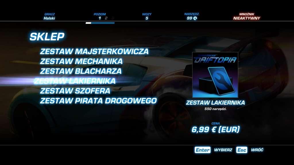 Wirtualny sklep, w którym płacimy realną gotówką, pęka w szwach. Możemy wydać zarówno 99 eurocentów na podstawowe samochody, jak i 20 euro na duży pakiet narzędzi i samochód najwyższej klasy. Poza tym, gra umożliwia wykupienie sobie znacznie szybszego zbierania doświadczenia – 50% więcej punktów za każdy przejazd? Nie ma problemu – niecałe 10 euro za 30 dni, albo 89 eurocentów za dobę. Każda gra „free to play” bazuje na sprzedaży ułatwień, ale wymóg płacenia za naprawę kartami, które dość szybko się kończą, jest krokiem w złą stronę. Wielu graczy uzna to za „skok na kasę” – zainwestowałeś dużo kart w samochód, rozbiłeś się i możesz go stracić? Płać!