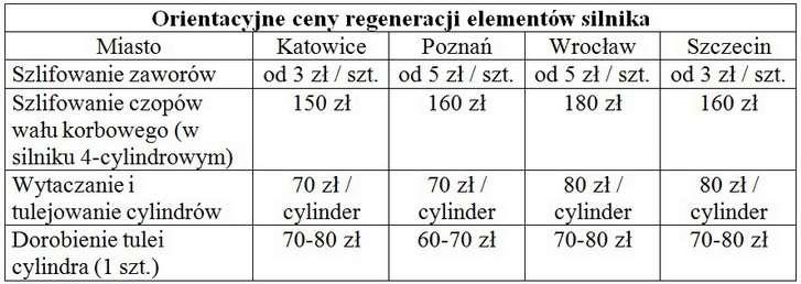 Cylindry, zawory oraz ich gniazda nie są jedynymi elementami narażonymi na uszkodzenia mechaniczne. Często wraz z nimi szlifowania wymagają czopy wału korbowego. Zdaniem fachowców ważne jest, aby ich regenerację przeprowadzać podczas jednego zamontowania wału w uchwytach szlifierki. Dlaczego? Z jednej strony gwarantuje to utrzymanie osiowości detalu, z drugiej zaś dokładność samego szlifowania w granicach od 0,25 do 0,1 mm, czyli 250-100 mikronów. Ostatnią czynnością jest wyważanie całego wału. Jest ona szczególnie istotna, ponieważ prawidłowo wykonana pozwala na wydłużenie jego żywotności. Ta ostatnia zaś przekłada się bezpośrednio na zmniejszenie drgań silnika, zużycie paliwa i wzrost mocy motoru. Nie zawsze jednak da się szlifować czopy wału korbowego. W Mercedesach Klasy A, czy np. Audi A6, są one laserowo utwardzane, co uniemożliwia ich mechaniczną regenerację. W razie wytarcia jedynym wyjściem jest niestety kosztowna wymiana całego wału. Ceny tej części wahają się, w zależności od modelu, od 1,5 do 4 tys. zł.