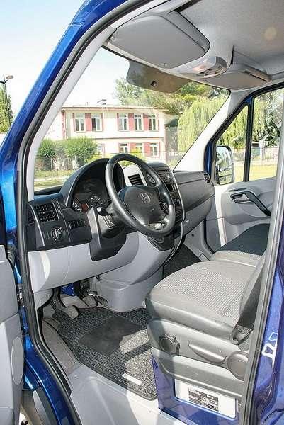 W kabinie mamy trzy fotele, kokpit z dużą ilością schowków, pojemne kieszenie w drzwiach, półkę zamontowaną przy podsufitce oraz liczne schowki w desce rozdzielczej. Poza przyciskiem z napisem NGT przy kolumnie kierownicy kokpit niczym się nie różni od tradycyjnych furgonów modelu Sprinter. Naciśnięcie przycisku nie zmienia też wizualnie wyświetlacza – wskaźnik poziomu jest ten sam dla gazu i benzyny, a podziałka zmienia się wraz z ilością paliwa w baku lub butlach. Przy pełnym zatankowaniu benzyny i gazu nie ma różnicy wskazań. W przypadku rezerwy gazu wyświetla się butla obok wskaźnik poziomu, a gdy skończy się paliwo gazowe auto automatycznie przełącza się na benzynę. Zamontowane pod podłogą butle z gazem nie kolidują z bakiem i nie zmniejszają go, podobnie jak przestrzeni ładunkowej. Wyeliminowano jedynie koło zapasowe, a pod siedzeniem pasażera umieszczono kompresor z nabojem wypełnionym klejem, na wypadek konieczności naprawy uszkodzonej opony.