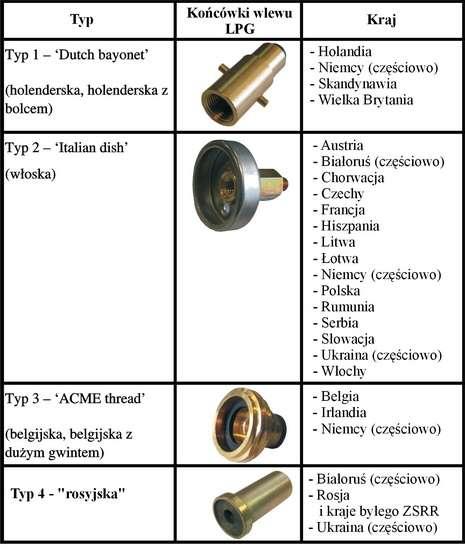 Autogaz dostępny jest pod różnymi nazwami: LPG, GPL czy Autogas, tak więc znalezienie odpowiedniego dystrybutora nie stanowi problemu. Jednak inaczej historia przedstawia się z pistoletami do tankowania i co za tym idzie końcówkami wlewu gazu występującymi w samochodach. Końcówka wlewu jest przystosowana do pistoletu, którym napełniany jest zbiornik samochodowy na stacji tankowania. Jeżeli na stacji występuje inny typ pistoletu niż w Polsce, wówczas należy zaopatrzyć się w odpowiednią redukcję na końcówkę wlewu, aby móc zatankować. Aktualnie istnieją cztery podstawowe typy końcówek, które występują w różnych krajach bez względu na ich położenie geograficzne. Dodatkowo należy zwrócić uwagę na rodzaj i rozmiar gwintu wewnętrznego końcówki wlewu typu włoskiego (italian dish) w samochodzie, w który najczęściej wkręca się redukcje i który może być M10 mm lub M14 mm i dobrać odpowiednią redukcję (adapter) lub zadbać by była uniwersalna (umożliwiała zastosowanie w obu typach wlewu włoskiego).