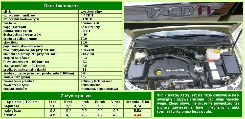 Zawieszenie pracuje bardzo cicho i, jak wskazuje jego konstrukcja, jest i powinno przez długi czas pozostać bezawaryjne. Podsumowując, pod maską ani pod samochodem przez pięć lat nie znaleźliśmy żadnych minusów. Zarówno cicho pracujący, elastyczny i nieprawdopodobnie oszczędny silnik, jak i proste w swej konstrukcji, ale udane zawieszenie, wywarły na nas bardzo pozytywne wrażenia. Mało tego, mechanizmy te ani razu nie wymagały interwencji mechanika. Dlatego też za silnik i układ jezdny Astra otrzymuje u nas piątkę.