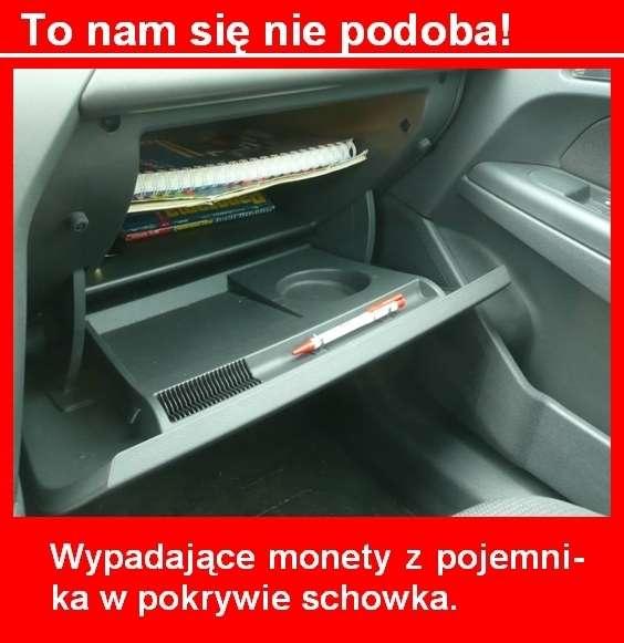 Ilość schowków wewnątrz auta można uznać za wystarczającą, chociaż i tu widać oszczędności w stosunku do poprzedniego modelu. Nie wiadomo, dlaczego zniknął mały zamykany schowek po stronie kierowcy, doskonałe miejsce na klucze czy telefon komórkowy. Pojemny schowek przed pasażerem siedzącym z przodu po otwarciu może służyć jako taca na napoje (posiada stosowne przetłoczenia) i miejsce do przechowywania monet. Nie radzimy jednak nikomu ich tam umieszczać. Silniejsze zamknięcie pokrywy lub nawet delikatne hamowanie spowoduje, że bilon wypadnie z brzękiem. Oprócz tego w samochodzie możemy jeszcze korzystać z kieszeni bocznych we wszystkich drzwiach, półeczki przy dźwigni hamulca ręcznego, a także kwadratowego pojemnika umieszczonego nad popielniczką dla podróżujących z tyłu.