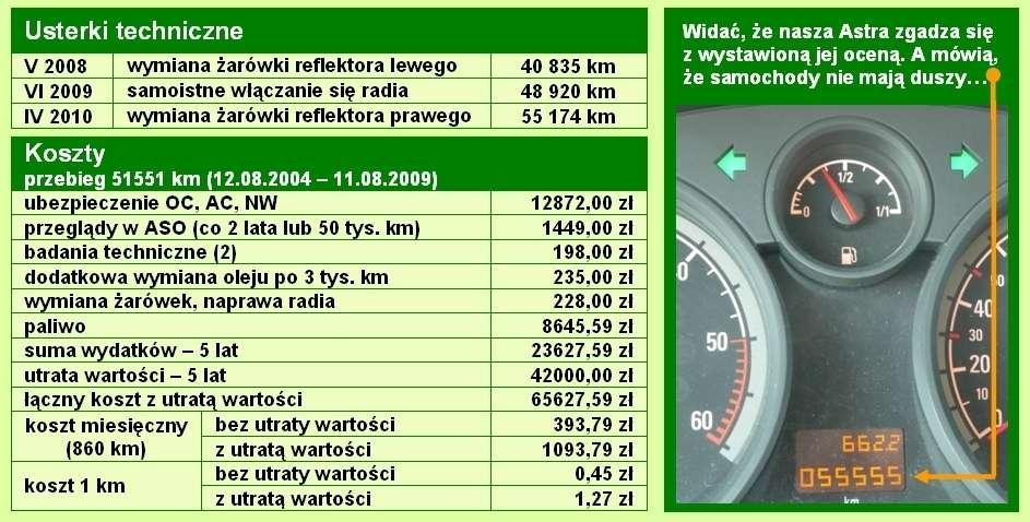 Jako że jesteśmy pierwszymi właścicielami Astry, najbardziej bije nas po kieszeni utrata wartości auta i koszty ubezpieczenia. Do tych wydatków dochodzą jeszcze opłaty za przeglądy w ASO (w tym celu, w ciągu pięciu lat, odwiedziliśmy serwis dwa razy). Reszta to sama rozkosz. Przy tak niezwykle skromnym zapotrzebowaniu na paliwo nie żal podjeżdżać na stację benzynową, a koszty napraw przez pięć lat to suma nieco ponad 200 złotych.