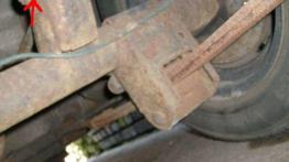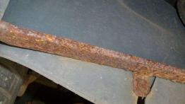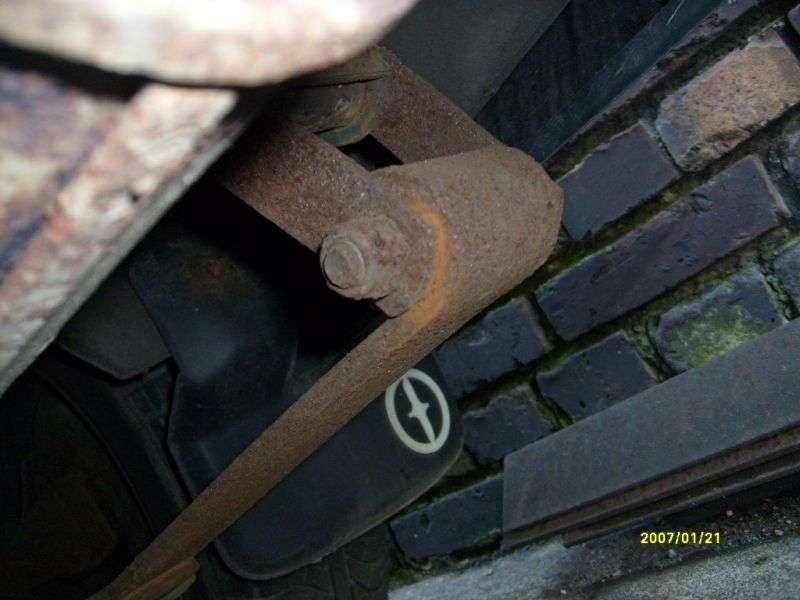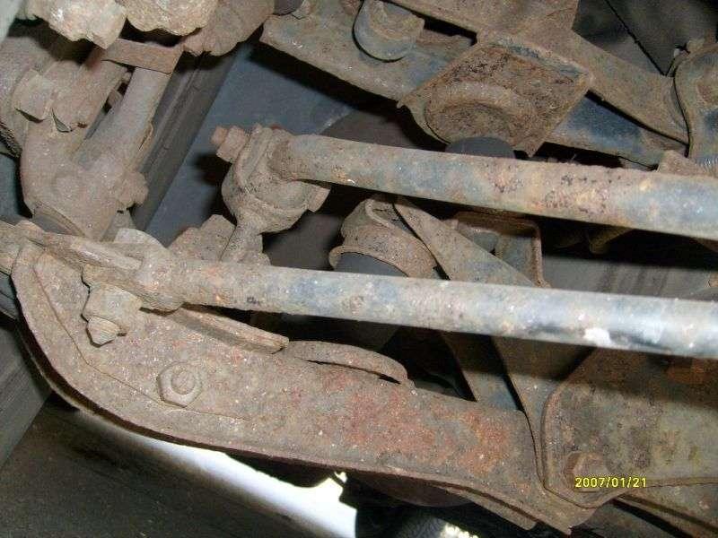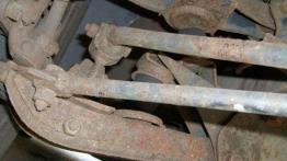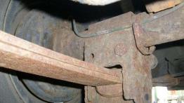 Bardzo stara konstrukcja, resory piórowe z tyłu często korodują i piszczą /Fot. 10, fot. 11/, przednie sworznie również często się wymienia /Fot. 12, Fot. 13/. Nagminnie wybijają się drążki stabilizujące tylnego mostu /Fot. 14/.
