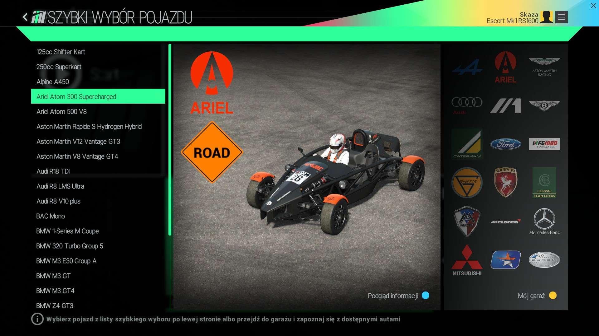 Wachlarz samochodów, mimo że spory, nie robi ogromnego wrażenia. Kilkadziesiąt samochodów wyselekcjonowano w taki sposób, by zapewnić różnorodność, ale nie ma wielu ciekawych maszyn, które możemy znaleźć w konkurencyjnych tytułach. Zabrakło w szczególności Japończyków (z drogowych maszyn jest tylko Mitsubishi Lancer Evo X FQ400). Poza tym mamy Astona Martina, BMW, Audi, Bentley'a, McLarena, Mercedesa, Pagani, Forda czy Lotusa. Zabrakło za to Ferrari, Lamborghini, wielu klasyków z lat 80. czy 90. czy chociażby Alfy Romeo, Chevroletów i sportowych Nissanów. Na plus należy zaliczyć szeroką gamę bolidów wyścigowych – zarówno współczesnych, jak i klasycznych. Świetna jest za to reprezentacja angielskich samochodów. Ginetta, Lotus, Aston Martin, Ariel, BAC, Caterham, McLaren i Radical to więcej niż mogliśmy oczekiwać.