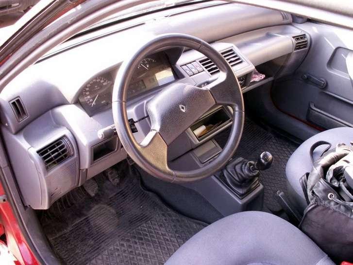 Czas zająć się wnętrzem. Po otwarciu wielkich drzwi, charakterystycznych dla wersji trzy drzwiowej, możemy wygodnie wsiąść na przednie fotele. Chcąc dostać się do tylnej kanapy musimy posiadać bardzo wygimnastykowane ciało. Zdecydowanie polecam wersję pięciodrzwiową. Fotele są stanowczo za miękkie, nie posiadają również trzymania bocznego. Przypominają mi stare kanapy z lat 60-tych. Zagłówki mają za mały poziom regulacji. Jeśli na fotelach zasiądą osoby mające 180cm wzrostu lub więcej, zagłówki przestają spełniać swoją rolę. Siedząc zdegustowany, zerkam na tablicę rozdzielczą. Wygląda całkiem nieźle. Ma cztery dysze nawiewu, obrotowe, podświetlane w nocy na bursztynowo przełączniki i pokrętła. Deska została wykonana z twardego plastiku. Nie mam zastrzeżeń do jej spasowania. W moim egzemplarzu do pasażerów nie docierają żadne, nieprzyjemne odgłosy skrzypienia. Obraz całości psuje brak regulacji kierownicy, chociażby w jednej płaszczyźnie oraz brak plastiku zakrywającego schowek. Według mnie absurdalna wręcz oszczędność. Na pewno zamontowanie tego kawałka plastiku wpędziłoby firmę Renault w tarapaty finansowe. Sam schowek jest stosunkowo mały. Kieszenie w drzwiach są również niewygodne. Ich płytkość sprawia, że większość przedmiotów w nich umieszczonych wypada na podłogę. W najtańszej specyfikacji RL, nie mamy co liczy na poduszki powietrzne, ABS, elektrykę szyb, lusterek, klimatyzację czy wspomaganie kierownicy, którego brak jest bardzo odczuwalny podczas miejskiego manewrowania. Aż dziwi obecność lusterek w osłonach przeciwsłonecznych po obu stronach, regulacja wysokości przednich pasów bezpieczeństwa i napinacze pasów.