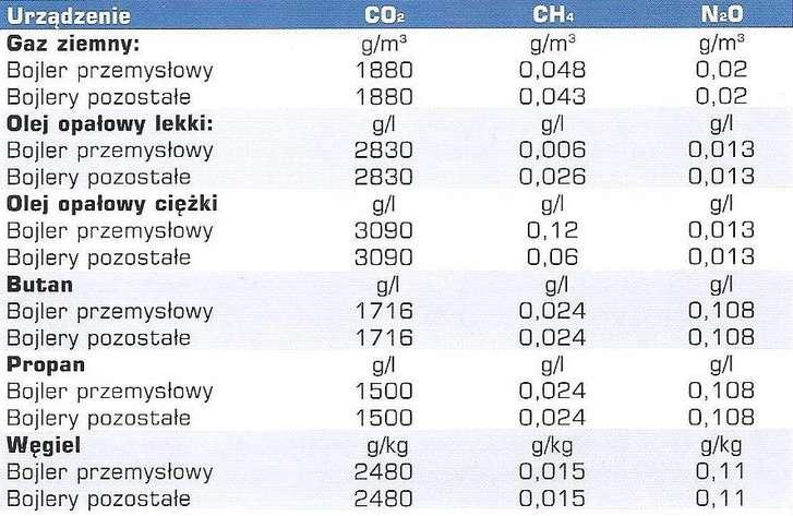Z uwagi na nieduże różnice w emisji spalin dla bojlerów przemysłowych i pozostałych do obliczeń przyjęto dane dla bojlerów pozostałych reprezentujących większość będących w użytku bojlerów. Na podstawie przyjętej kaloryczności paliw, poniżej podano uzyskane wyniki obliczeń współczynnika emisji dwutlenku węgla w gramach na megadżul.