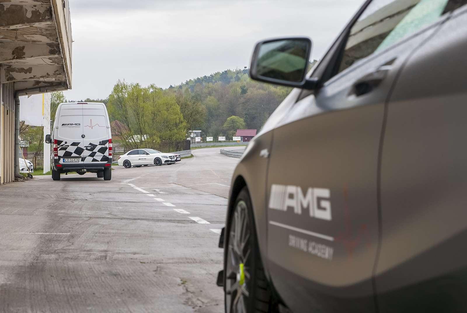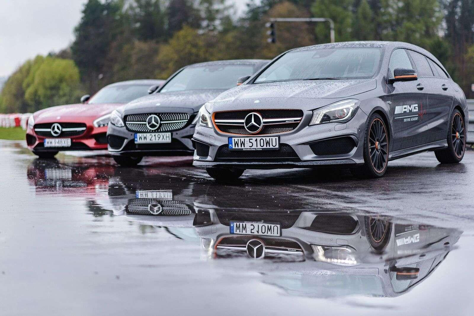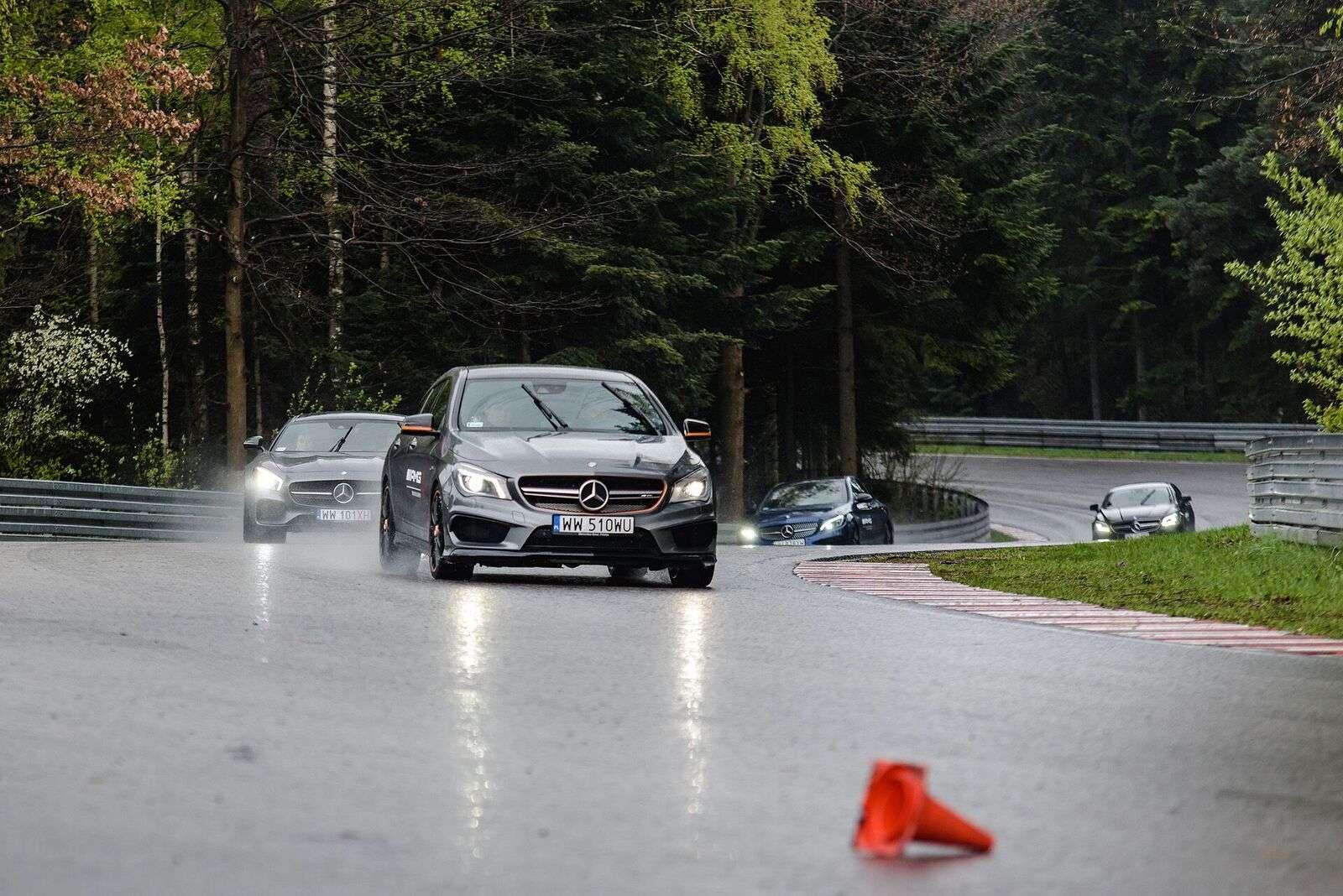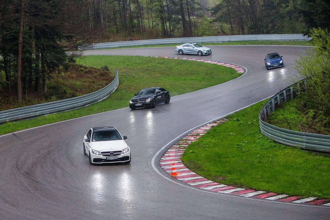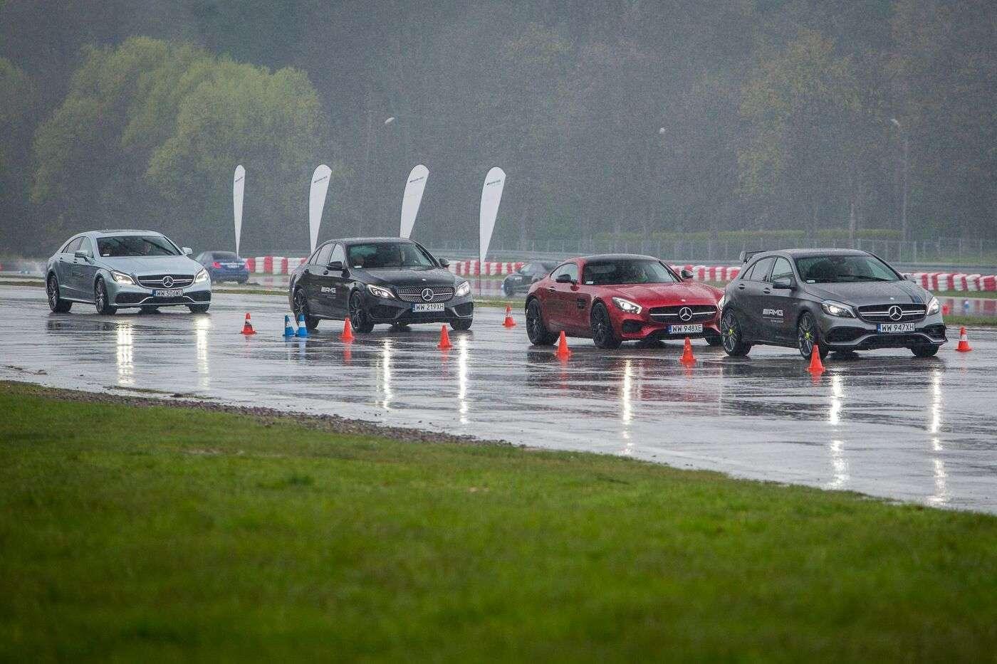 Po przyjeździe na tor, z samego rana wszystkie obecne panie wzięły udział w szkoleniu teoretycznym. Poprowadził je Janusz Dudek, instruktor AMG Driving Academy z wieloletnim stażem i trener profesjonalnych zawodników wyścigowych. Na początek rzeczy proste, banalne wręcz, ale warte przypomnienia. Prawidłowe ustawienie fotela, technika jazdy w zakręcie, schematyczny zarys tego, co nas czeka. Choć niektóre panie odczuwały lekki niepokój patrząc na lejące się z nieba hektolitry deszczu i pokaźne cieki wodne tworzące się na nawierzchni toru, inne z niecierpliwością i uśmiechem wyczekiwały startu. W międzyczasie za kierownicą 360-konnego Mercedesa CLA 45 AMG Shooting Brake każda wykonała czasowy przejazd, aby podzielić nas na dwa zespoły – szybszy i… ten poruszający się z większą gracją. Każdej szóstce został przydzielony jeden instruktor, który (zapewne zastanawiając się jak zapanować nad taką wesołą gromadką) wyprowadził nas na tor.