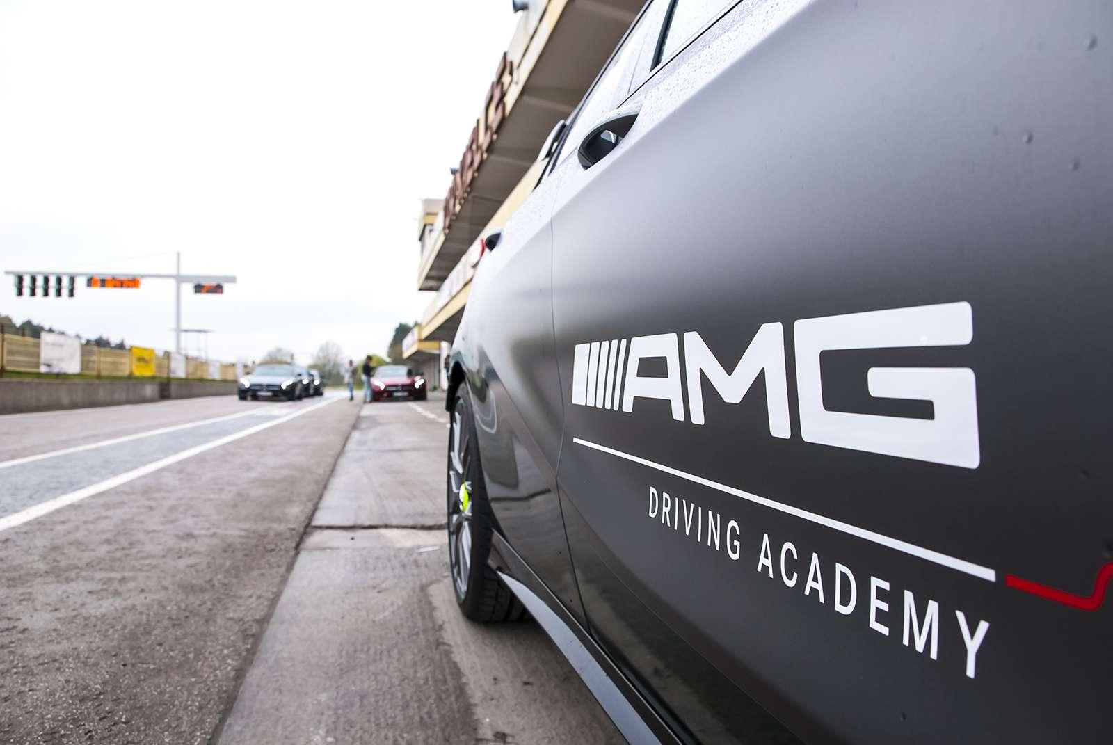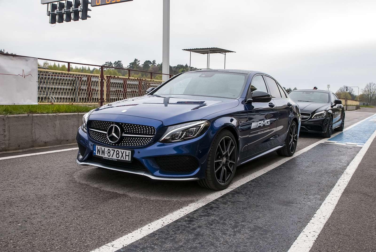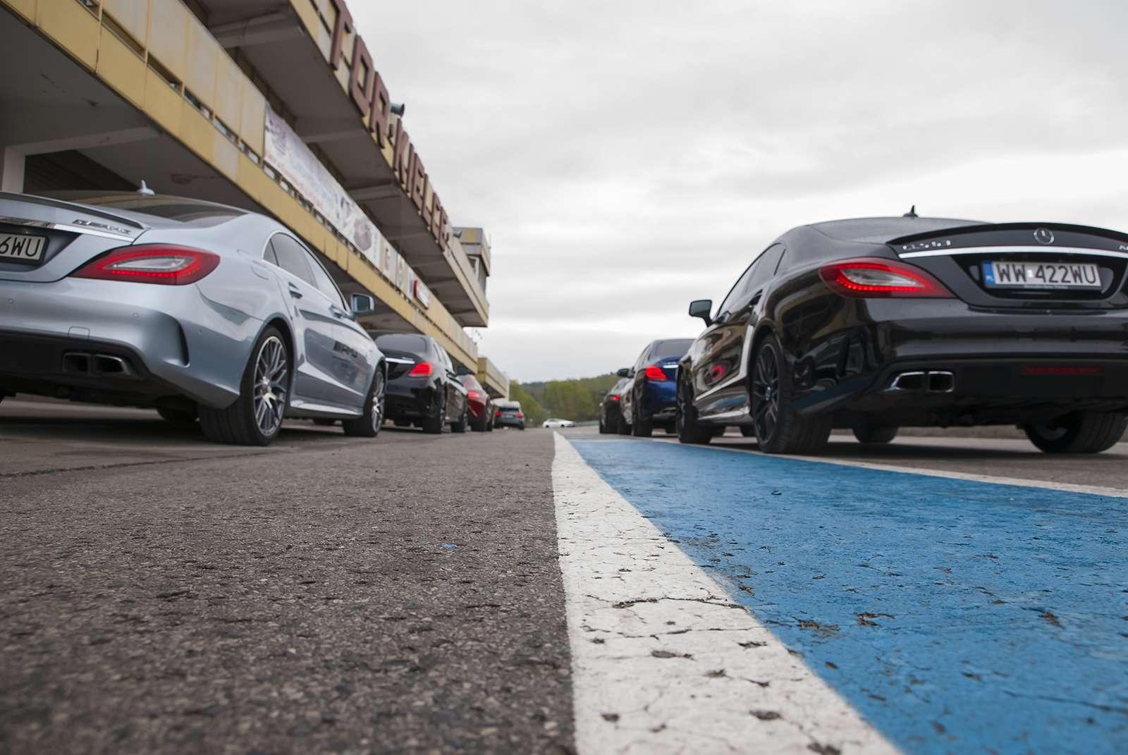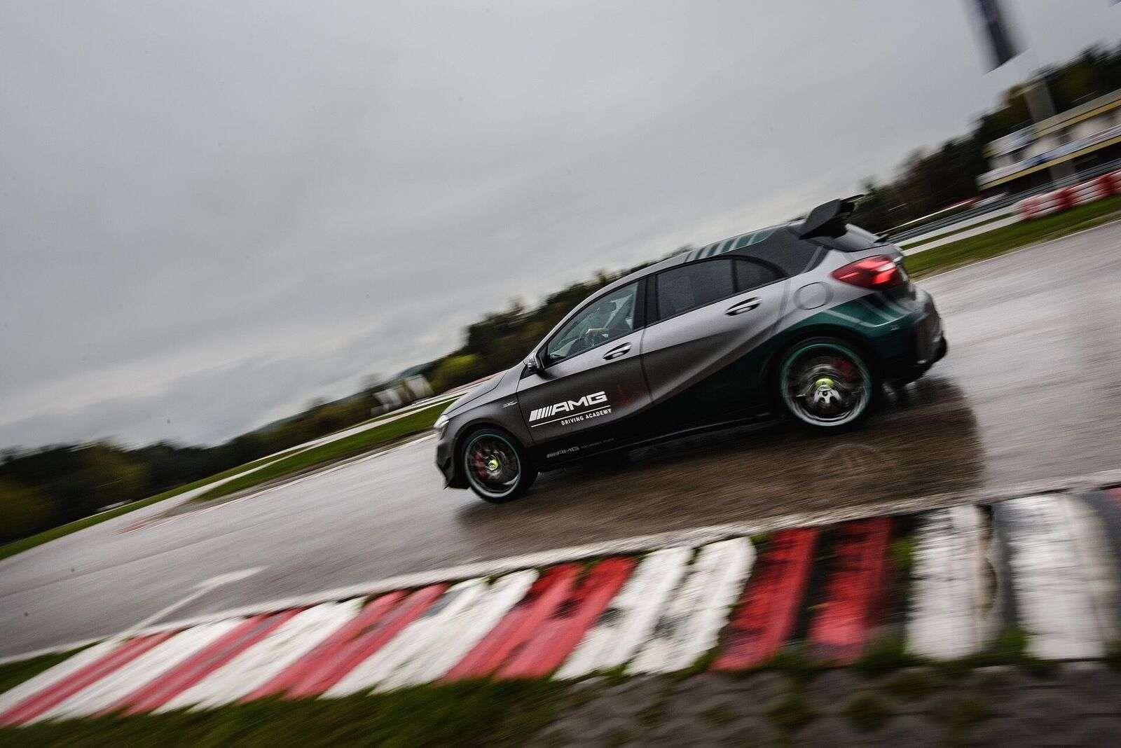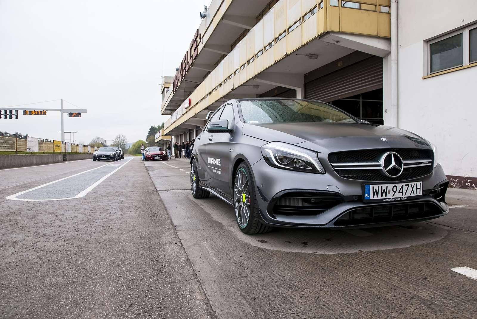 Po przyjeździe na tor, z samego rana wszystkie obecne panie wzięły udział w szkoleniu teoretycznym. Poprowadził je Janusz Dudek, instruktor AMG Driving Academy z wieloletnim stażem i trener profesjonalnych zawodników wyścigowych. Na początek rzeczy proste, banalne wręcz, ale warte przypomnienia. Prawidłowe ustawienie fotela, technika jazdy w zakręcie, schematyczny zarys tego, co nas czeka. Choć niektóre panie odczuwały lekki niepokój patrząc na lejące się z nieba hektolitry deszczu i pokaźne cieki wodne tworzące się na nawierzchni toru, inne z niecierpliwością i uśmiechem wyczekiwały startu. W międzyczasie za kierownicą 360-konnego Mercedesa CLA 45 AMG Shooting Brake każda wykonała czasowy przejazd, aby podzielić nas na dwa zespoły – szybszy i… ten poruszający się z większą gracją. Każdej szóstce został przydzielony jeden instruktor, który (zapewne zastanawiając się jak zapanować nad taką wesołą gromadką) wyprowadził nas na tor.