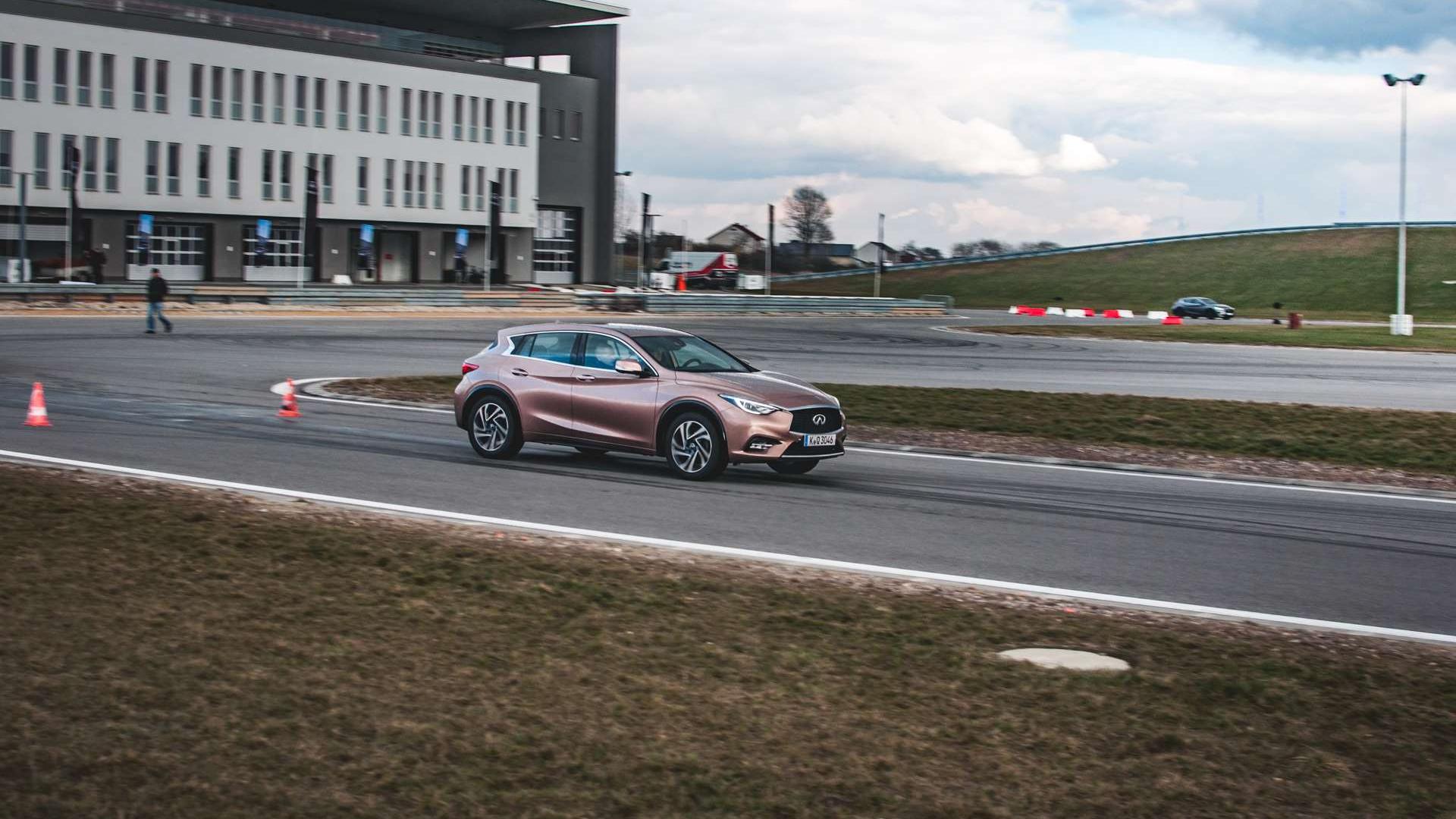 I tak docieramy do prób torowych. Pokonaliśmy małą i dużą pętlę Toru Jastrząb, które obfitowały w ciasne zakręty, krótkie proste, kilka nawrotów i… przejazd przez wzniesienie. Styl jazdy na takiej trasie powinien być jak najbardziej płynny - kto walczył z samochodem i zaliczył dynamiczny, efektowny przejazd, nie miał szans w starciu z liderami klasyfikacji.Przejdźmy jednak wreszcie do tego, jak w takich warunkach zachowuje się Infiniti Q30. Wydawałoby się, że w wersji Sport, czyli z 2-litrowym silnikiem benzynowym o mocy 211 KM, dwusprzęgłową skrzynią biegów i napędem na obie osie, powinien odpowiadać specyfice próby. I o ile z trakcją czy ruchami nadwozia nie było większych problemów i mogliśmy spokojnie oddawać się sztuce dobierania odpowiedniego toru jazdy, to przeszkodziła nam w tym skrzynia biegów. Jej charakter jest zdecydowanie bardziej drogowy niż sportowy. Nawet w trybie „S” była zbyt wolna, by nadążyć za tym, co działo się na torze. Wciskając gaz w momencie punktu styku z wewnętrzną częścią zakrętu, Q30 zaczynał przyspieszać dopiero na prostej, bo w samym zakręcie zajęty był redukowaniem biegów. Żeby skutecznie i szybko jeździć po torze, chyba trzeba by było wciskać gaz w pierwszej fazie zakrętu.