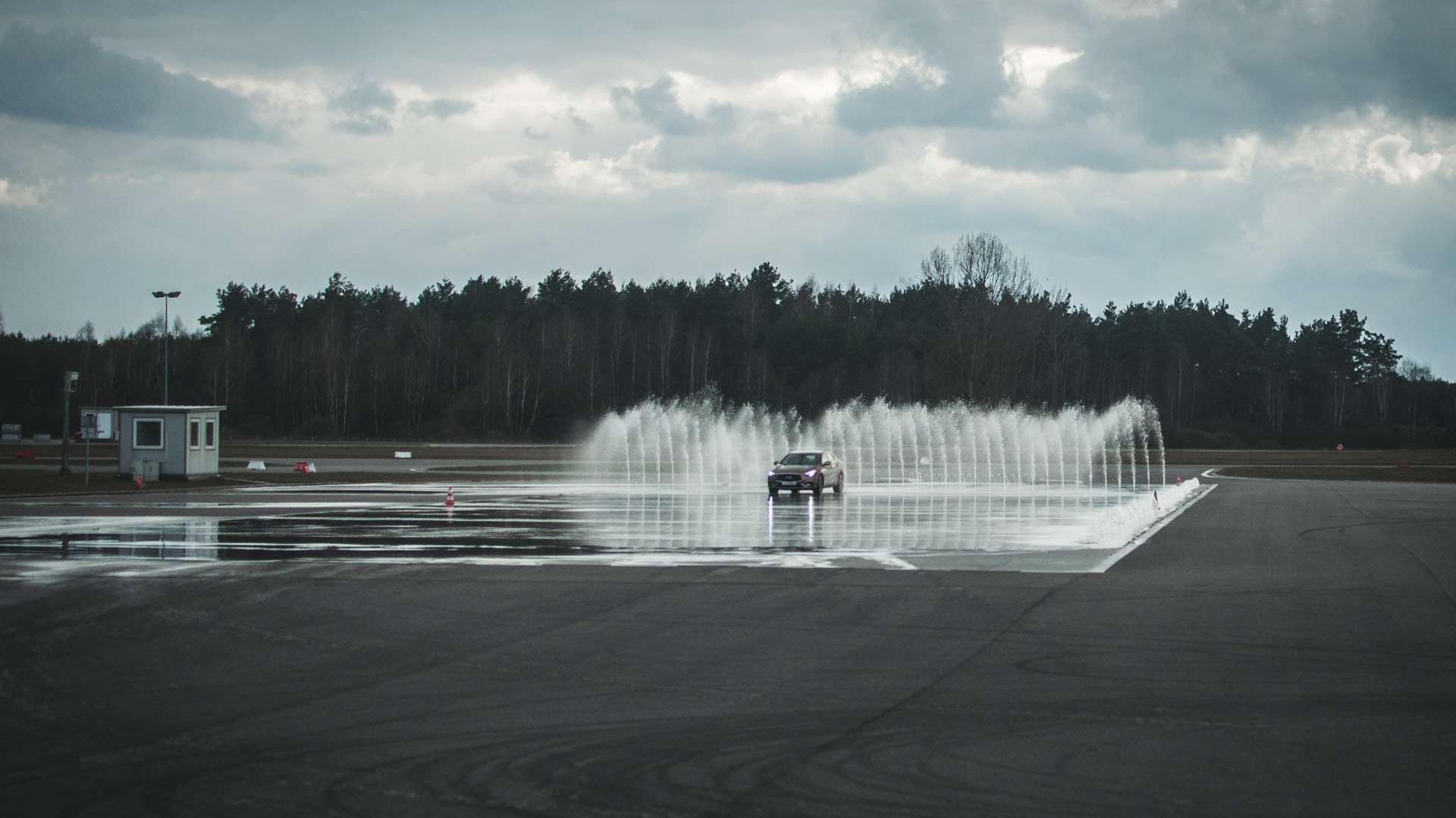 Ostatnią próbą w tym miejscu był „test łosia” z zatrzymaniem. Najeżdżaliśmy na płytę z prędkością 80 km/h, a zaraz przed maską pojawiały się trzy kurtyny wodne w formie slalomu. Nie wiedzieliśmy jednak z której strony i kiedy się pojawią. Tu znów ukłon w stronę inżynierów odpowiadających za systemy stabilizacji. Przeszkody można było ominąć, hamując z maksymalną siłą, a Infiniti Q30 wcale nie traciło na stabilności. „Można było ominąć” - ale nie wszystkim się to udało. Instruktorzy wytłumaczyli nam, że tę próbę zazwyczaj zalicza każdy kursant, jeśli prędkość oscyluje wokół 65 km/h. Podniesienie jej do 70 km/h odsiewa już wielu kandydatów, przy 75 km/h test zalicza raptem kilka osób, a przy 80 km/h prawie nikt. A przecież różnica to tylko 5 km/h. Warto o tym pamiętać, kiedy następnym razem w centrum miasta spróbujecie rozpędzić się do 80 km/h na ograniczeniu do 50 km/h.