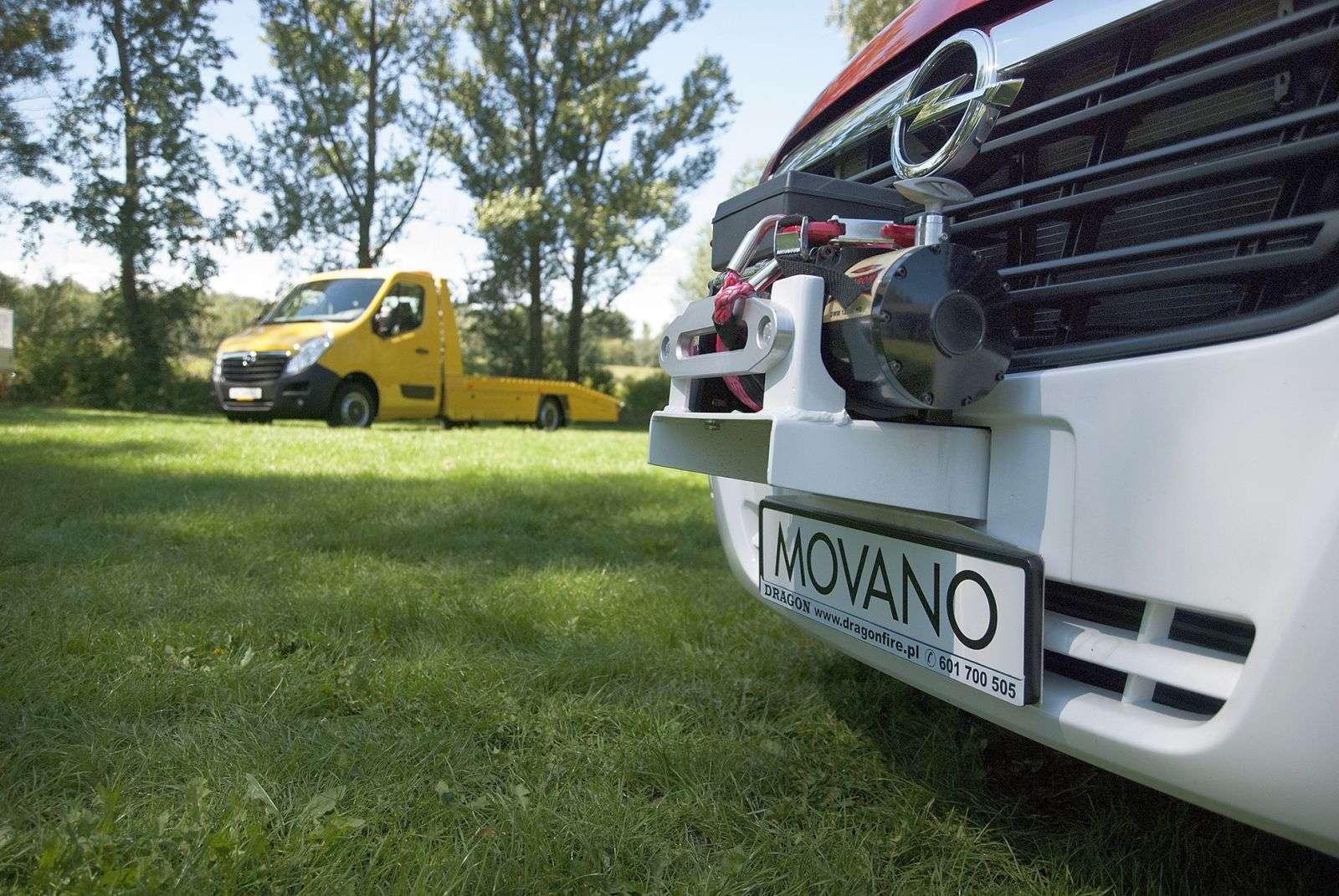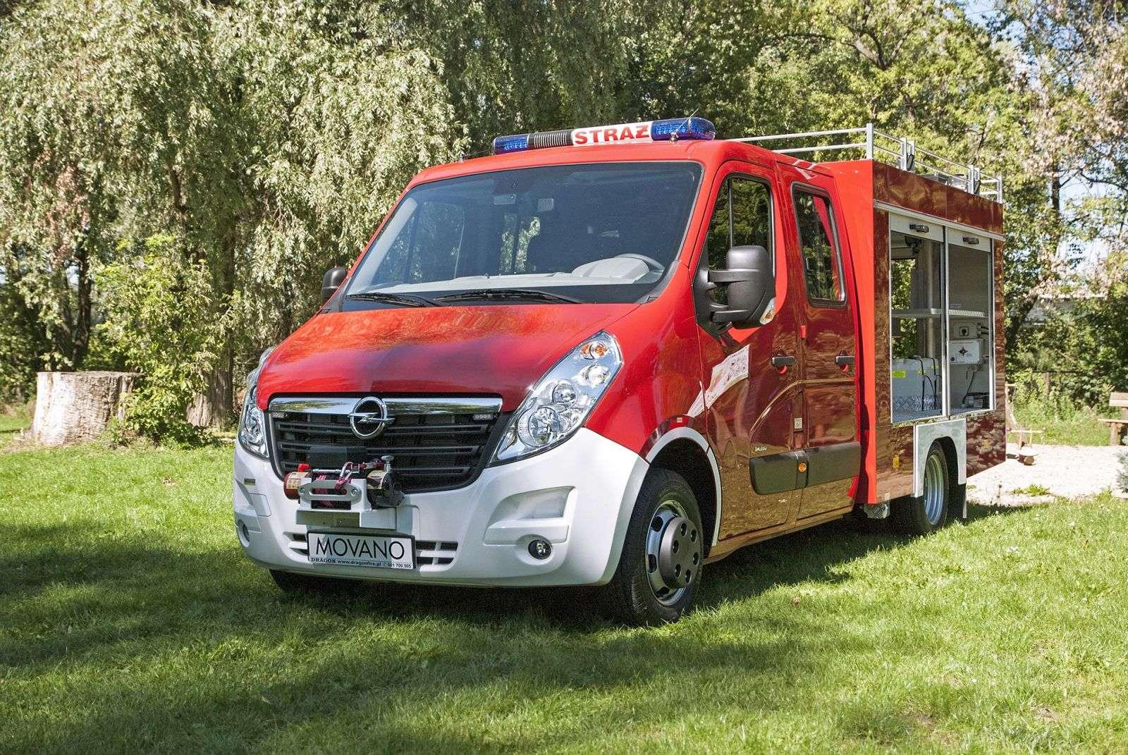 Po dotarciu na miejsce pierwszym autem, które od razu rzuciło się w oczy, był Opel Movano przerobiony specjalnie na potrzeby straży pożarnej. Kompaktowy wóz strażacki posiada wszystko, czym mogą pochwalić się jego więksi bracia: wyciągarkę przymocowaną do przedniego zderzaka, syreny alarmowe w duecie z niebieskimi kogutami oraz specjalnie zaprojektowany zbiornik na środek gaśniczy. Znajduje się on w tylnej części pojazdu i może pomieścić aż tonę substancji. Przez to niepozorne Movano waży aż 4,5 tony.