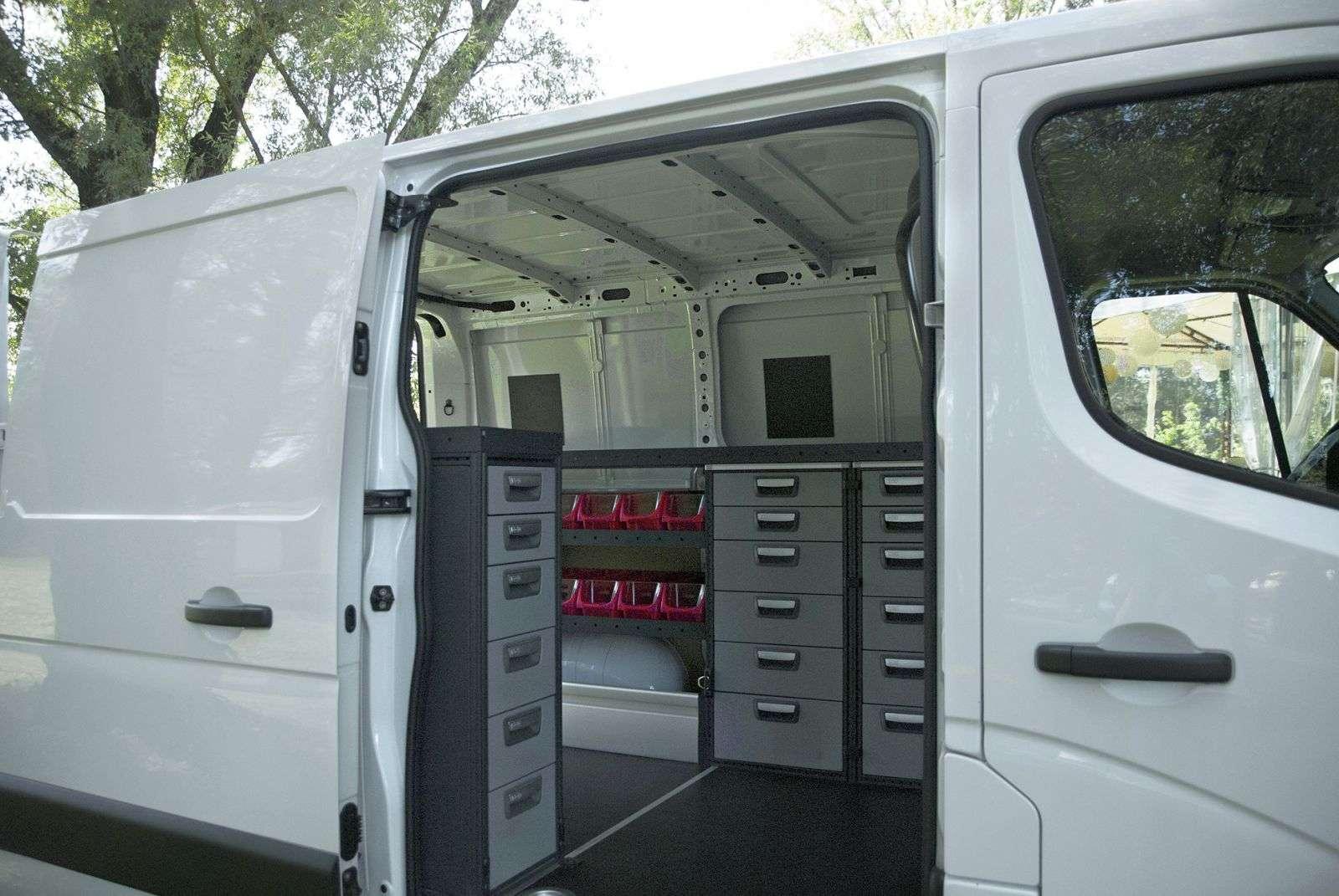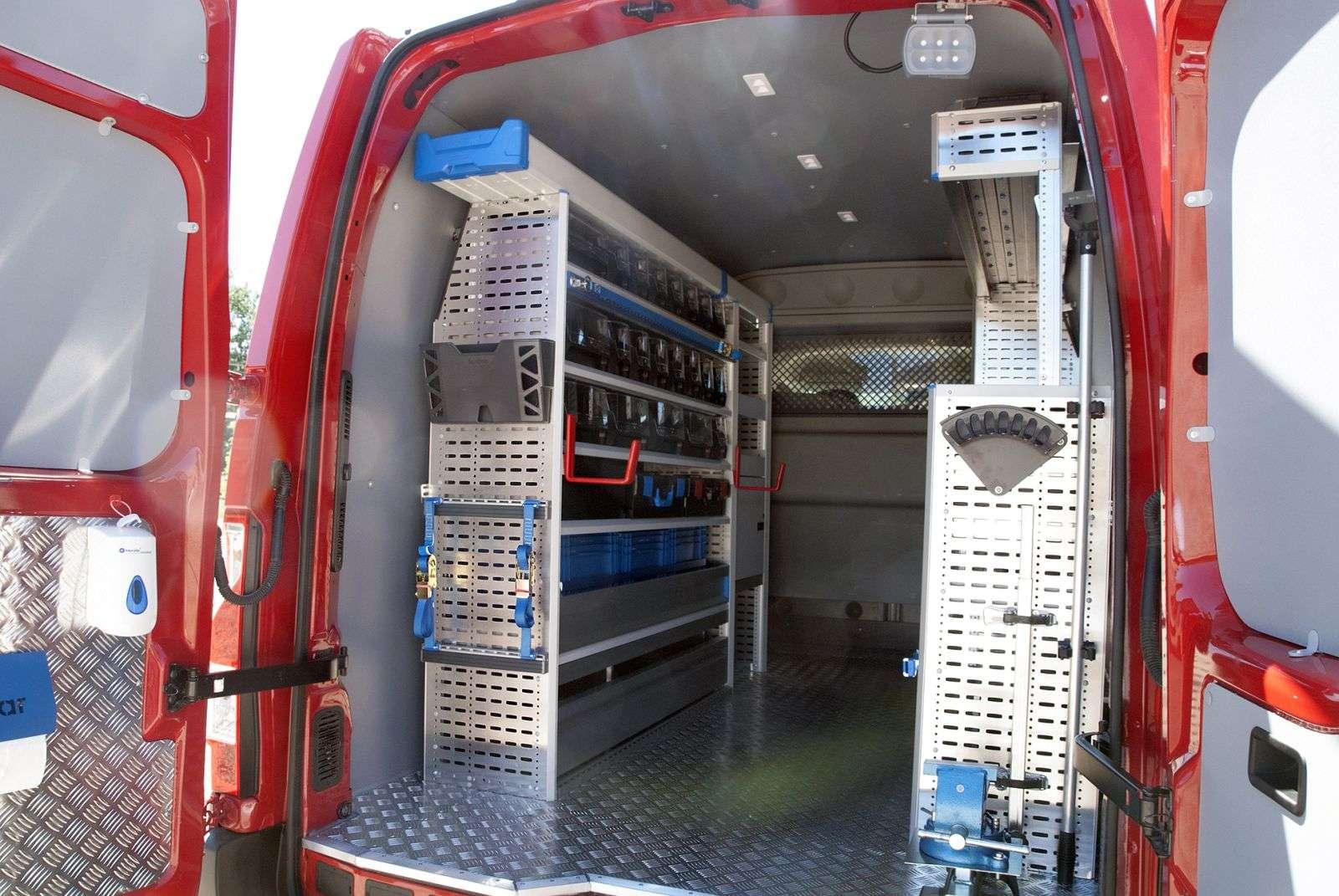 W ramach jazd testowych mieliśmy przyjemność zabrać na przejażdżkę model Movano w wersji tradycyjnej oraz drugi, z napędem na cztery koła. Co by nie mówić to drugie auto robi niemałe wrażenie. Krwistoczerwony kolor, podwójne tylne koła a na dachu nie tylko drabina i żuraw, ale także „koguty” i megafon! To wóz serwisowy z prawdziwego zdarzenia. Po otwarciu tylnych drzwi trudno nie otworzyć ust ze zdumienia. Cała przestrzeń towarowa została w bardzo przemyślany sposób zabudowana, aby potencjalny mobilny serwis miał jak najbardziej ułatwioną pracę. Szufladki, szafki, schowki. Trudno się połapać w ich ilości. Wszystkie rozwiązania są jednak bardzo dobrze przemyślane, by podczas jazdy nic się nie otworzyło, a zawartość nie rozsypała się po całym wnętrzu. Dodatkowo na pokładzie jest imadło oraz stół do pracy przy mniejszych zleceniach. Na tylnych drzwiach znalazło się miejsce na… zbiornik z wodą, mydło oraz papierowe ręczniki! Opel Movano w tej wersji zabudowy jest całkowicie niezależnym warsztatem na kołach, w którym mechanik po zakończonej pracy może nawet umyć ręce.