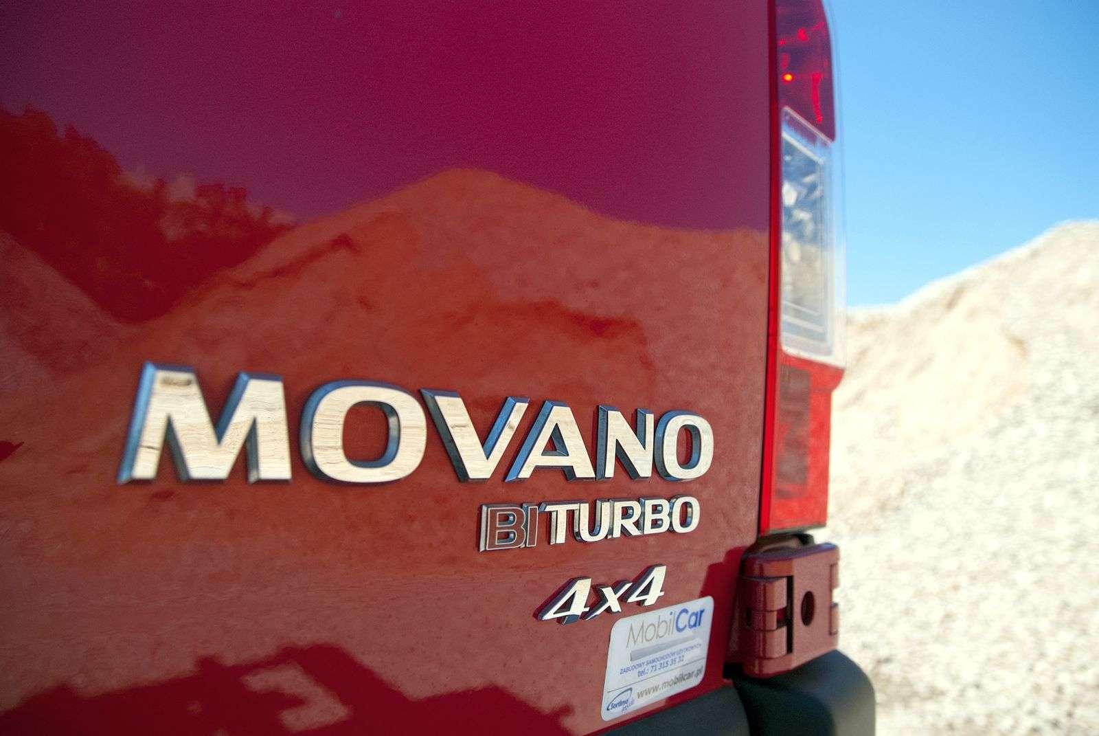Pod maską uterenowionego busa znalazł się silnik 2.3 CDTI BiTurbo o mocy 163 koni mechanicznych i maksymalnym momencie obrotowym wynoszącym 360 Nm. Takie parametry w zupełności wystarczają do żwawego poruszania się 4,5-tonowym Movano. Ta wersja może się bowiem pochwalić dopuszczalną masą całkowitą wynoszącą 4500 kilogramów, z czego sama ładowność to aż 2254 kg. W porównaniu do jazdy standardowym „blaszanym” Movano z silnikiem 2.3 CDTI o mocy 125 koni mechanicznych, wariant 4x4 z serwisową zabudową jest nieco bardziej ospały. Można mu to jednak wybaczyć ze względu na dużo większą masę.