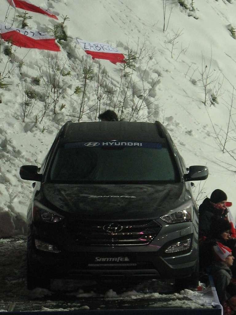 Na początku podkreślam, że nie było łatwo sprostać temu zadaniu wśród gromkiego śpiewu kibiców i huku dobrze znanych wuwuzeli, które zagłuszały odbiór jakichkolwiek bodźców. Wśród tego ogromnego tłumu, pod skocznią, dumnie prezentowały się Hyundaie: i30, ix35 oraz i40. Pomimo ekscytacji samymi skokami, samochody również cieszyły się dużym zainteresowaniem. Jak wiemy, to flagowe samochody tego producenta, który jest bardzo popularny w naszym kraju, znane zwłaszcza wszystkim kibicom skoków narciarskich. Oprócz nich pojawił się jeszcze jeden – najbardziej wyróżniony Hyundai Santa Fe, umieszczony na platformie przy samej skoczni, ponieważ najbardziej wpisuje się w zimowy obraz górskiego krajobrazu. Już niedługo na łamach naszego serwisu znajdzie się test tego właśnie samochodu, który jest nowością i przedstawicielem tak ostatnio popularnych SUV-ów. Hyundai jako sponsor techniczny federacji FIS użycza całą swoją flotę na każdy konkurs Pucharu Świata, tak było również w Wiśle. Dzięki temu można było zobaczyć samochody marki Hyundai, które przywoziły sędziów i zawodników oraz pomagały w organizacji tego wydarzenia.
