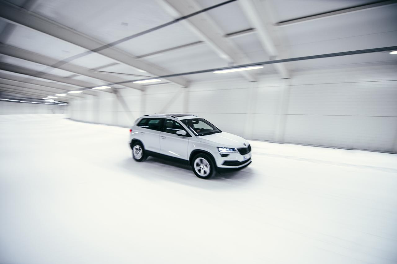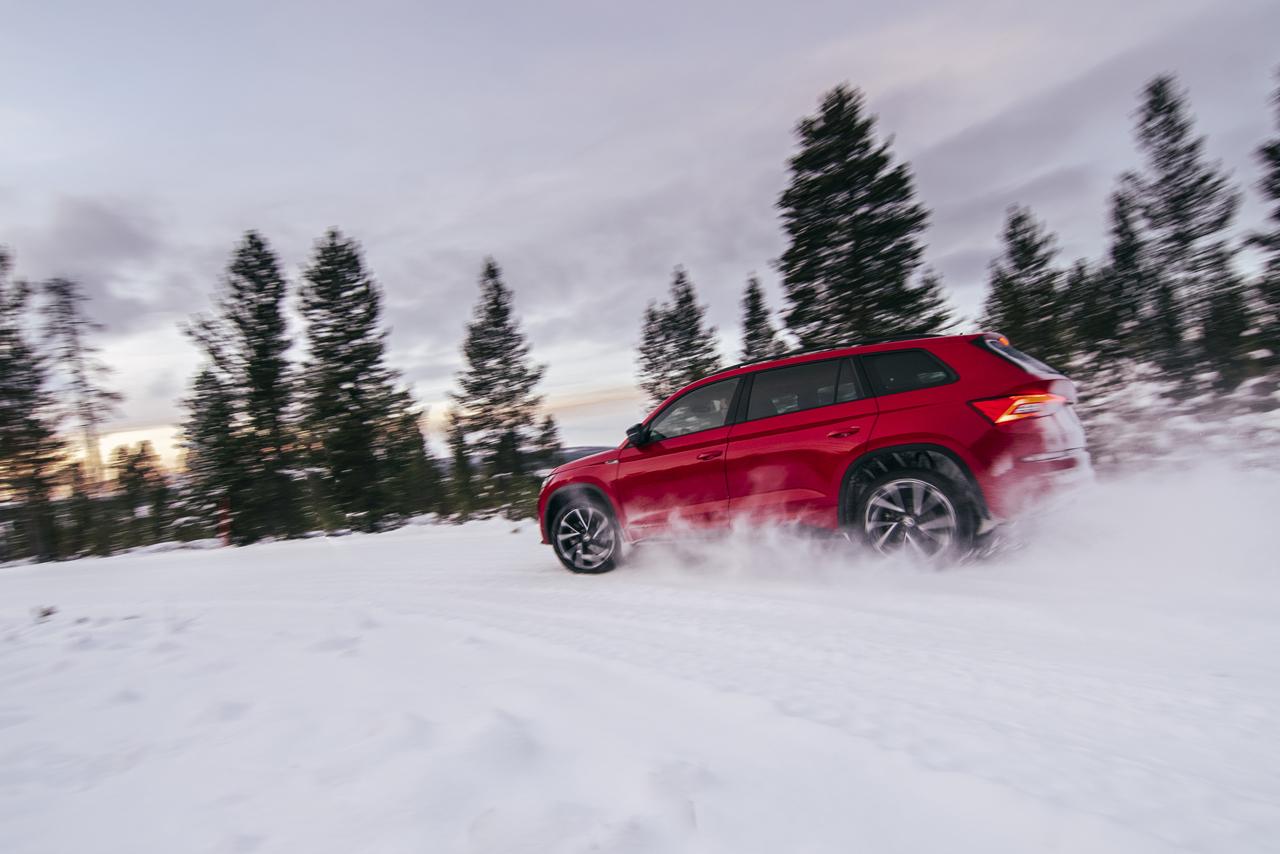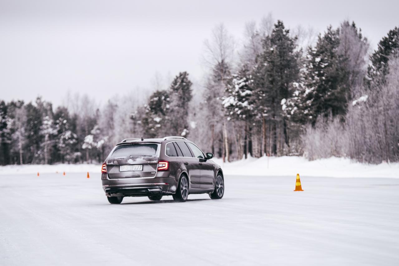 Najprostszy wydawał się slalom na dwóch rodzajach nawierzchni – śniegu i lodzie. Tutaj niewątpliwie najlepiej spisywała się Octavia, która przy nisko usytuowanym środku ciężkości oraz dużo ciężej działającym układzie kierowniczym najlepiej utrzymywała wyznaczony tor jazdy. Oczywiście to wszystko z racjonalnego punktu widzenia, ponieważ największy Kodiaq dawał nam najwięcej frajdy, właśnie dlatego, że był najmniej stabilny. I choć wychodziłem z niego z największym uśmiechem na ustach, to wyniosłem z tej lekcji również dużo informacji. W realnych warunkach na drodze, trzeba na niego uważać najbardziej. W środku stawki usytuował się Karoq, który bardzo poprawnie, choć nie idealnie pokonywał trasę. Warto jednak wyjaśnić, że choć samochody mają stały napęd na cztery koła, to na tylną oś trafia zaledwie 4% momentu obrotowego przy normalnej jeździe. To wszystko dzięki zastosowaniu sprzęgła wielopłytkowego Haldex piątej generacji, które zapewnia stały napęd 4x4, a dopiero w przypadku utraty przyczepności rozdziela moment na poszczególne koła.