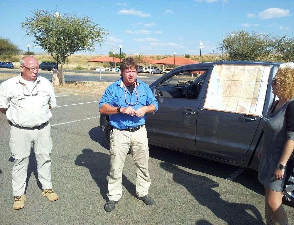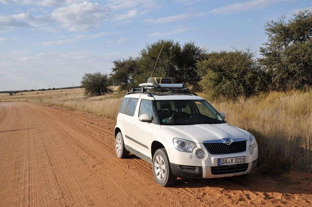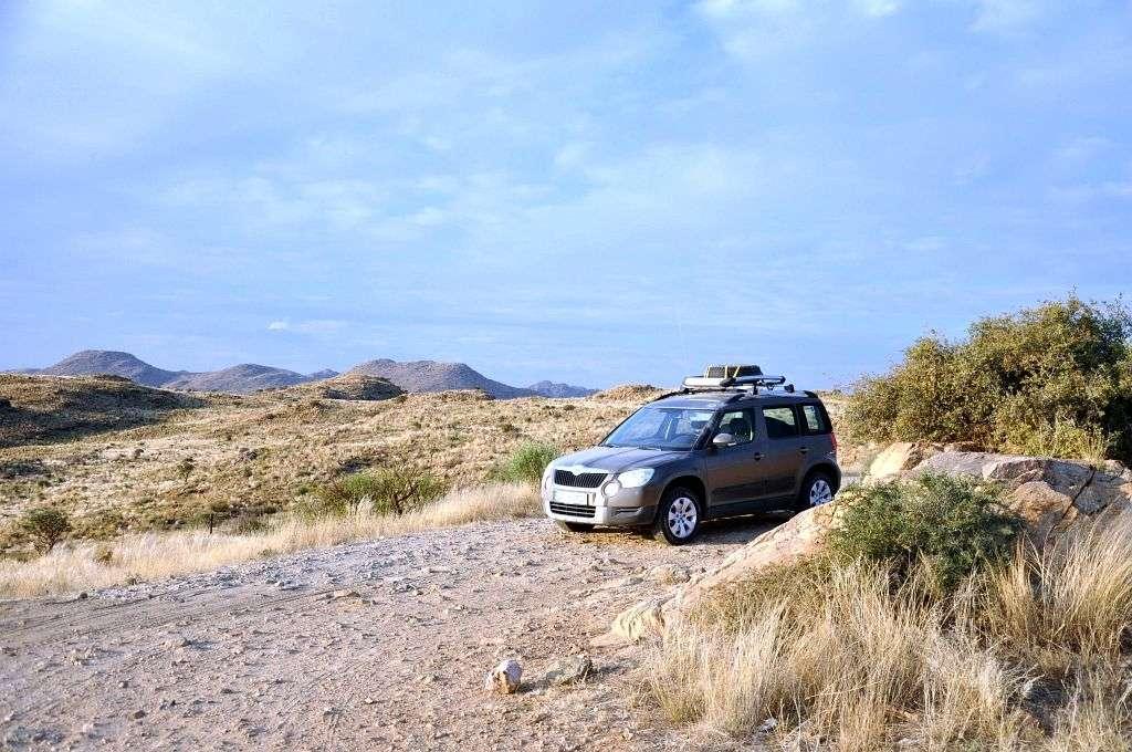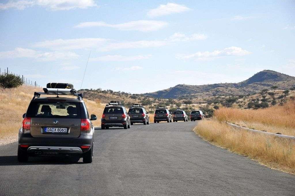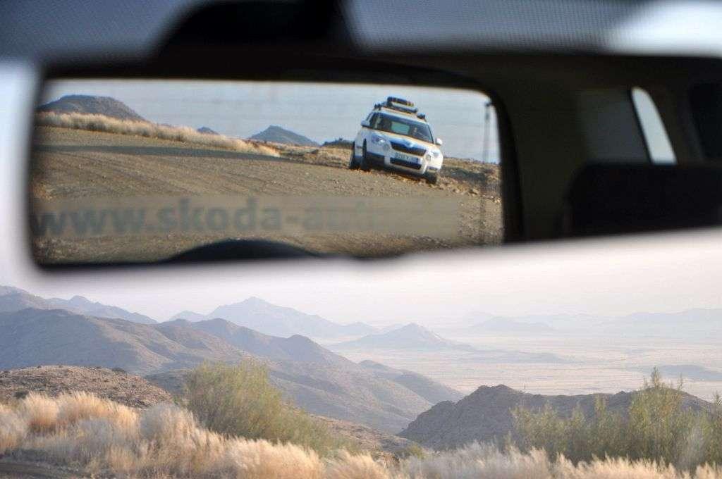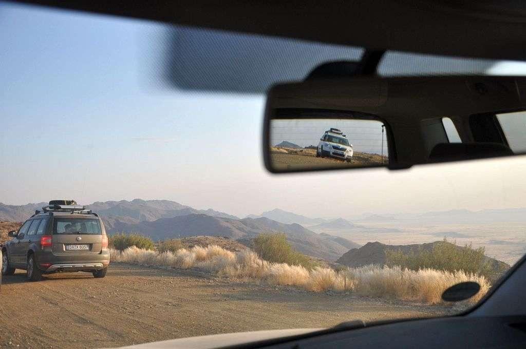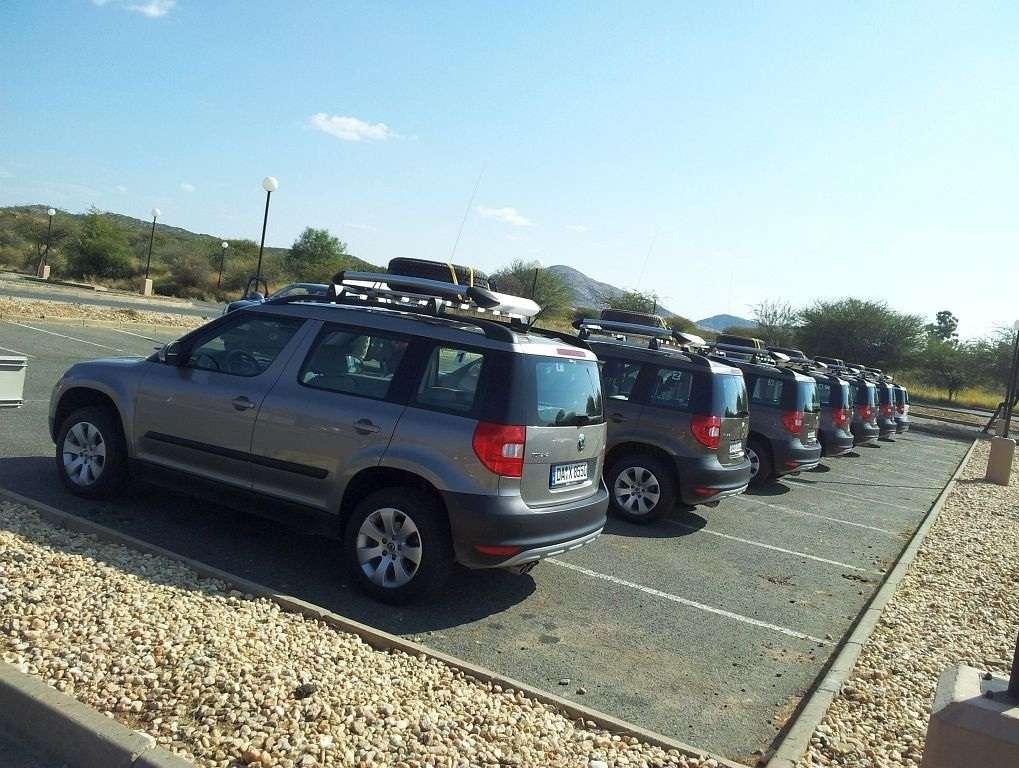 Pod hotelem widzimy wreszcie rząd lśniących samochodów, gotowych do wyjazdu w pustynię. Skody Yeti TDI 4x4 z manualnymi skrzyniami biegów. Niemieckie numery rejestracyjne z Darmstadt dodają uroku i bez tego egzotycznym samochodom z kierownicą po złej stronie. Tak, tak – kierownica jest po złej, lewej stronie – bo w Namibii jest ruch lewostronny a więc wszystkie tutejsze auta mają kierownicę po prawej „angielskiej” stronie.