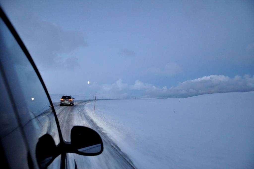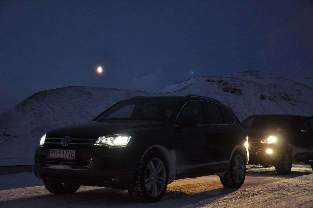 Auta mkną w kolumnie po błyszczącej w reflektorach nadjeżdżających pojazdów drodze. Wydaje się, że jedziemy po lodzie, jednak kilka prób hamowania uspokaja nas – przyczepność nie jest najgorsza. Pozwalamy sobie więc na nieco mniejsze odstępy i robienie zdjęć kolumny na tle powoli rozjaśniającego się na wschodzie nieba.