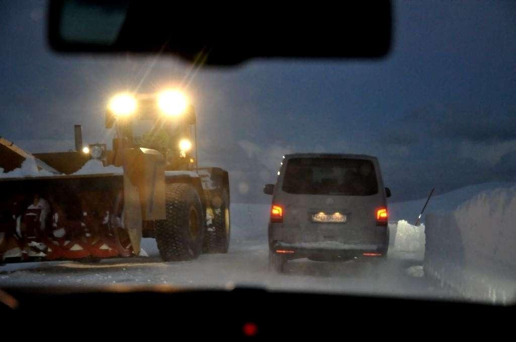 Po wynurzeniu się z kolejnego tunelu widzimy pierwszą bramkę. Bramkę, to może za dużo powiedziane… Zwykły szlaban w czasie większych opadów zatrzymuje samochody i pozwala im na dalszą jazdę dopiero wtedy, gdy nadchodzi godzina wyjazdu pługu, który przewodzi całej procesji. To przez te godziny musieliśmy się obudzić tak wcześnie, aby być tu o właściwej porze, ale po drugiej stronie góry „styropian” już nie sypie, a warunki na drodze są przyzwoite. Mniej więcej do tego samego wniosku musiała dojść siła wyższa pilnująca tej trasy, bo szlaban jest podniesiony. Droga wolna, jedziemy dalej.