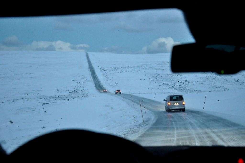 Pogoda zmienia się nagle, zamieniając monotonną podróż w wyzwanie. Z nieba sypie ani to śnieg, ani to grad. Płatki śniegu mają rozmiar i konsystencję płatków śniadaniowych i ustalamy wspólnie, że ten rodzaj śniegu nazywać będziemy styropianem. Śniegu na drodze przybywa błyskawicznie, a na horyzoncie pojawia się pierwszy pług. Zwiększamy odstępy, ponieważ droga staje się coraz bardziej górzysta, a pod warstwą „styropianu” nie jesteśmy w stanie wypatrywać oblodzonych fragmentów drogi.
