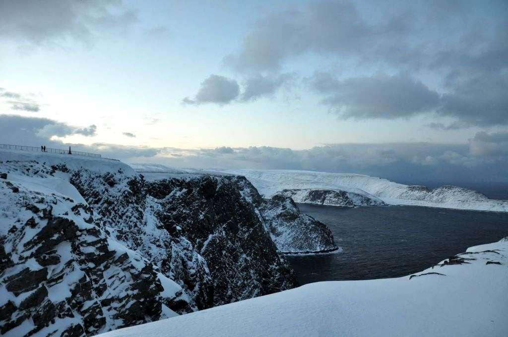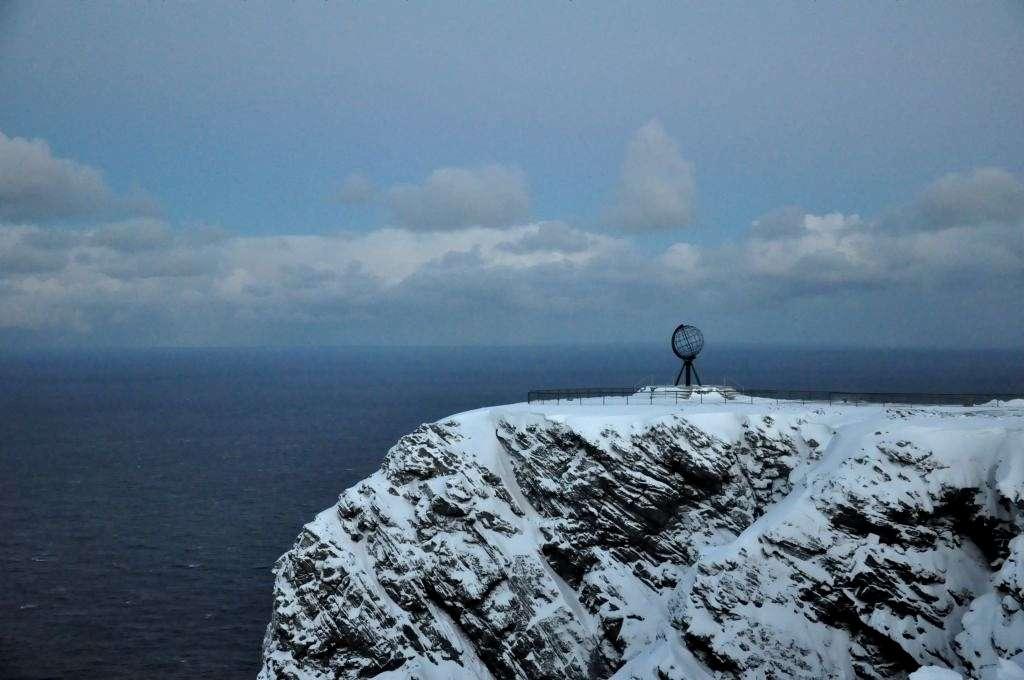 Widoki na miejscu zrekompensowały jednak brak emocji podczas jazdy. Nordkapp cieszy się złą sławą, jeśli chodzi o warunki pogodowe w zimie – śnieżyce i mgły potrafią zredukować widoczność niemal do zera. My mamy jednak dużo szczęścia. Powietrze jest przejrzyste, a między ciężkimi ołowianymi chmurami prześwituje nawet gdzieniegdzie ciemnogranatowe niebo. Ogromna przestrzeń aż zapiera dech – chyba, że to przenikliwy zimny wiatr. Nie chce wiedzieć, co tu musi się dziać przy -20°C, skoro teraz, ledwo parę stopni poniżej zera, z trudem operuję zmarzniętymi palcami przy aparacie fotograficznym.