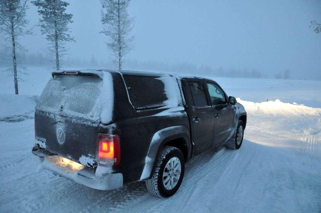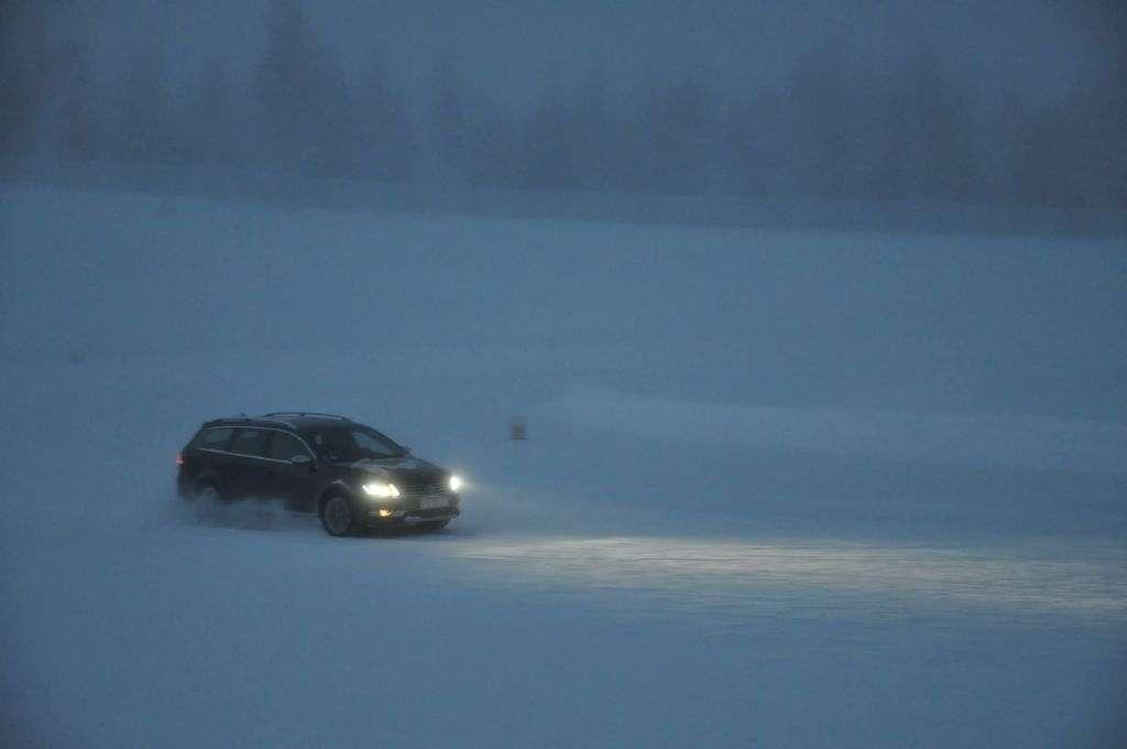 Oblodzone rondo było testem dla Amaroka i Passata. Obydwa auta ześlizgiwały się bez kolców z wewnętrznej, oblodzonej części ronda i dopiero kilka metrów na zewnątrz łapały przyczepność. Naokoło ronda można było więc przejechać powoli, lub bardziej efektownie - dodając mocniej gazu z kierownicą zwróconą do wewnątrz zakrętu. Wówczas auto ponownie zrywało przyczepność, stawało się nadsterowne i przy umiejętnym operowaniu gazem i z kontrą na kierownicy potrafiło przejechać długim slajdem całe rondo, wzbijając tumany śnieżnego kurzu spod czterech kół. Nie powiem raczej nic odkrywczego, ale znacznie lepiej jechało mi się w tym ćwiczeniu Passatem, gdyż był lżejszy i bardziej poręczny od Amaroka.