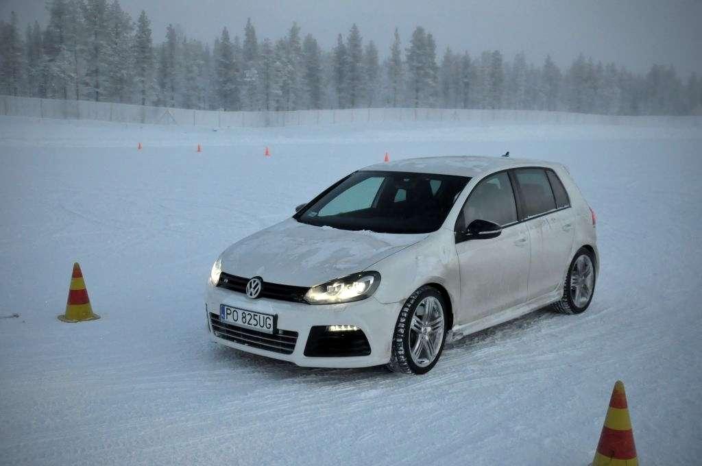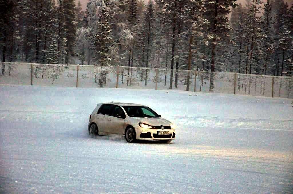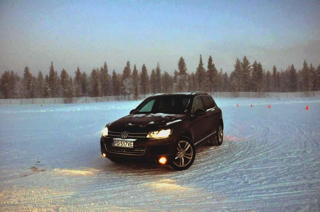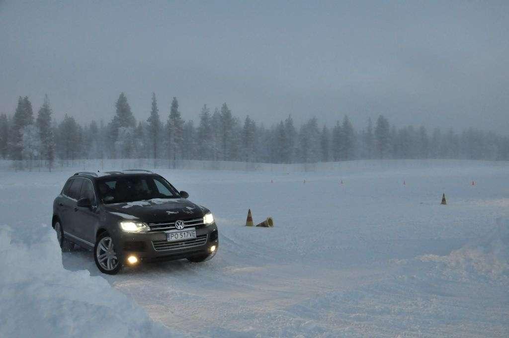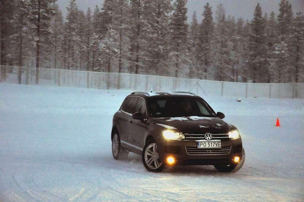Po obowiązkowej przerwie na rozgrzewającą herbatę (temperatura na zewnątrz utrzymywała się w okolicy -18°C) zmieniliśmy auta na Golfa R i Touarega, którymi trenowaliśmy slalom. Ponownie, mniejsze auto było bardziej poręczne, ale też klasyczny ręczny hamulec i mocny silnik w Golfie pozwalały na więcej w chwilach, kiedy trzeba było obrócić auto naokoło pachołka, lub wprowadzić go w dłuższy kontrolowany poślizg. W przypadku Touarega mocy również nie brakowało - potężny silnik 4,2 TDI V8 o mocy 340 KM z łatwością i na każde zawołanie mielił kołami zarówno na lodzie, jak i na śniegu. Trzeba było jedynie uważać na to, aby poślizg tym kolosem nie stał się niekontrolowany przez oblodzoną nawierzchnię - a właściwie to przez wszechobecny pancerz lodowy, przysypany gdzieniegdzie obiecująco wyglądającą warstwą śniegu.