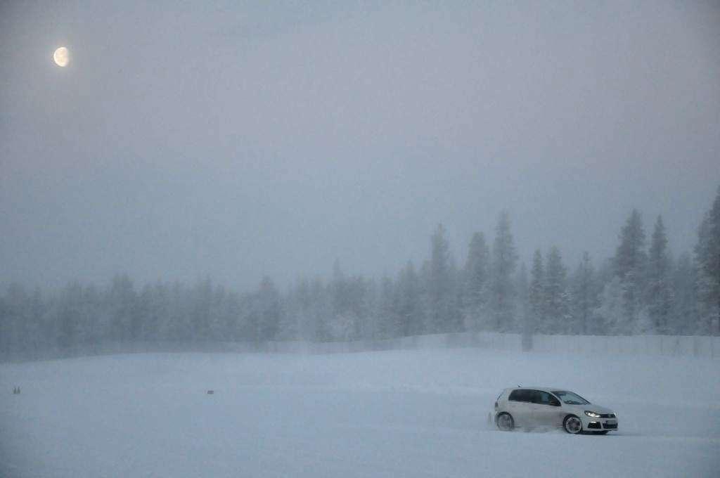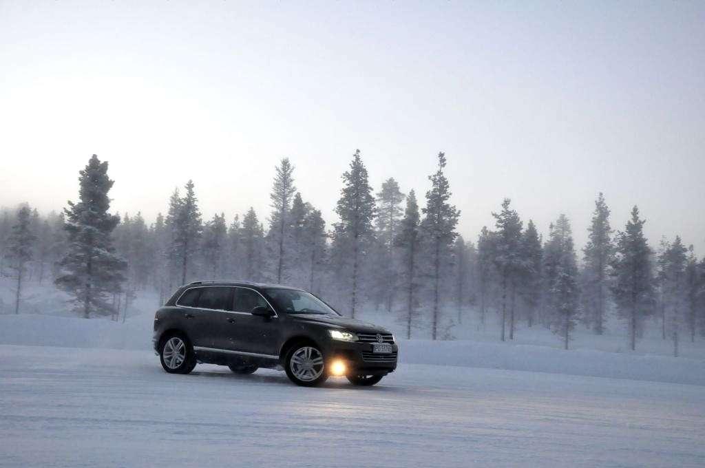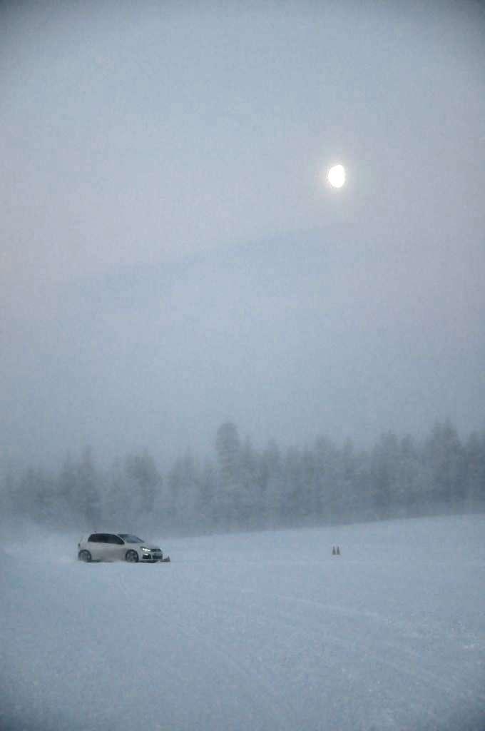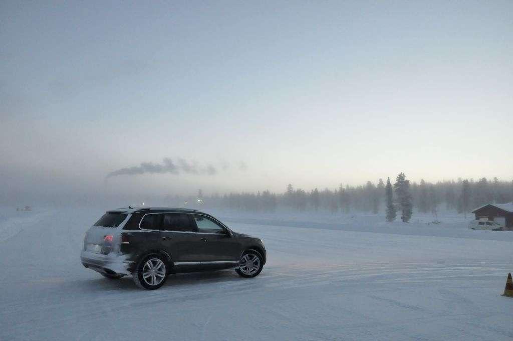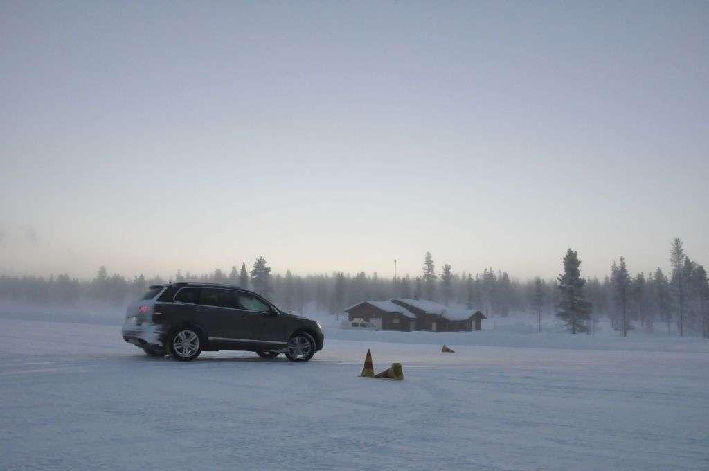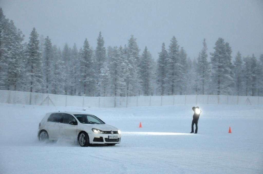 Po obowiązkowej przerwie na rozgrzewającą herbatę (temperatura na zewnątrz utrzymywała się w okolicy -18°C) zmieniliśmy auta na Golfa R i Touarega, którymi trenowaliśmy slalom. Ponownie, mniejsze auto było bardziej poręczne, ale też klasyczny ręczny hamulec i mocny silnik w Golfie pozwalały na więcej w chwilach, kiedy trzeba było obrócić auto naokoło pachołka, lub wprowadzić go w dłuższy kontrolowany poślizg. W przypadku Touarega mocy również nie brakowało - potężny silnik 4,2 TDI V8 o mocy 340 KM z łatwością i na każde zawołanie mielił kołami zarówno na lodzie, jak i na śniegu. Trzeba było jedynie uważać na to, aby poślizg tym kolosem nie stał się niekontrolowany przez oblodzoną nawierzchnię - a właściwie to przez wszechobecny pancerz lodowy, przysypany gdzieniegdzie obiecująco wyglądającą warstwą śniegu.