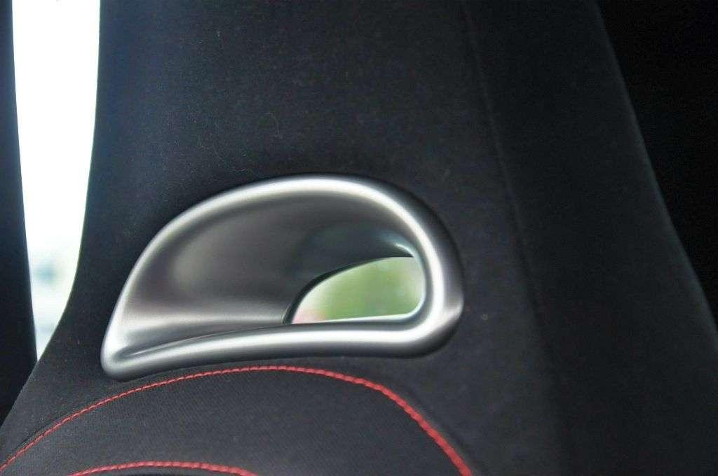 We wnętrzu także czuć sportowego ducha. Znajdziemy tu specjalnie dla tego modelu opracowaną, spłaszczoną u dołu kierownicę ze skórzanymi elementami, spory fragment centralnej konsoli w kolorze nadwozia, aluminiowe nakładki na pedały i wszechobecne przeszycia czerwoną nicią. Sportowe fotele nie grzeszą wielkością, ale mają regulację w pionie, dobre trzymanie boczne a do tego nieźle wyglądają.