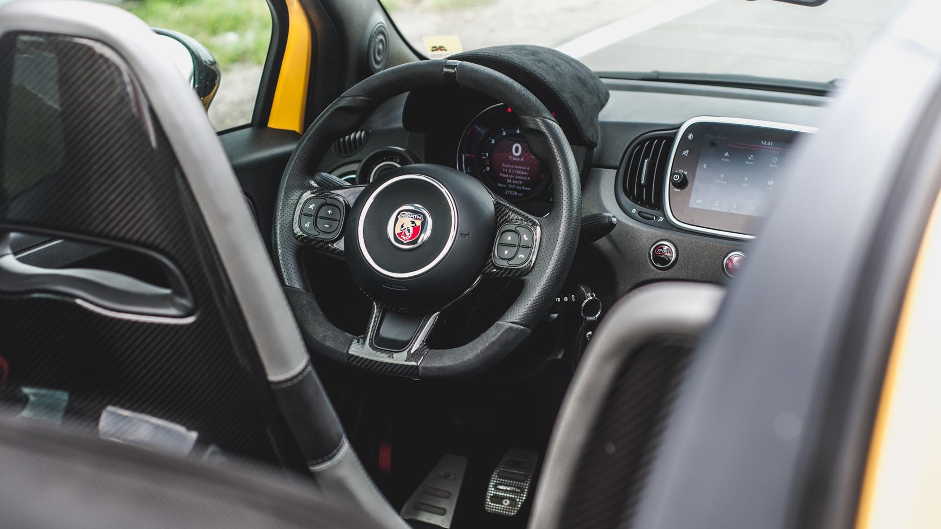 Pozycja za kierownicą nie jest sportowa. Bardziej przypomina jazdę niskim minivanem, ale dotyczy to tak zwykłych Fiatów 500, jak i wielu innych małych hot hatchy. Siedzimy po prostu za wysoko, a jeśli mamy więcej niż 1,75 wzrostu, rzutuje to też na inne elementy jazdy.