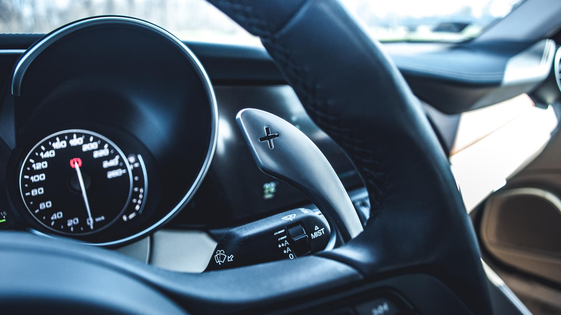 Deskę rozdzielczą już znamy - i wygląda właściwie identycznie, jak w Quadrifoglio. Fajnie, minimalistycznie, ale plastikom czegoś brakuje. Niczego nie brakuje za to kierownicy, która została przeniesiona ze sportowej wersji - jest na niej nawet czerwony przycisk do odpalania silnika!