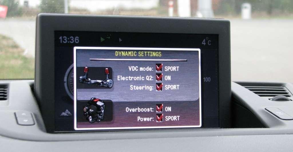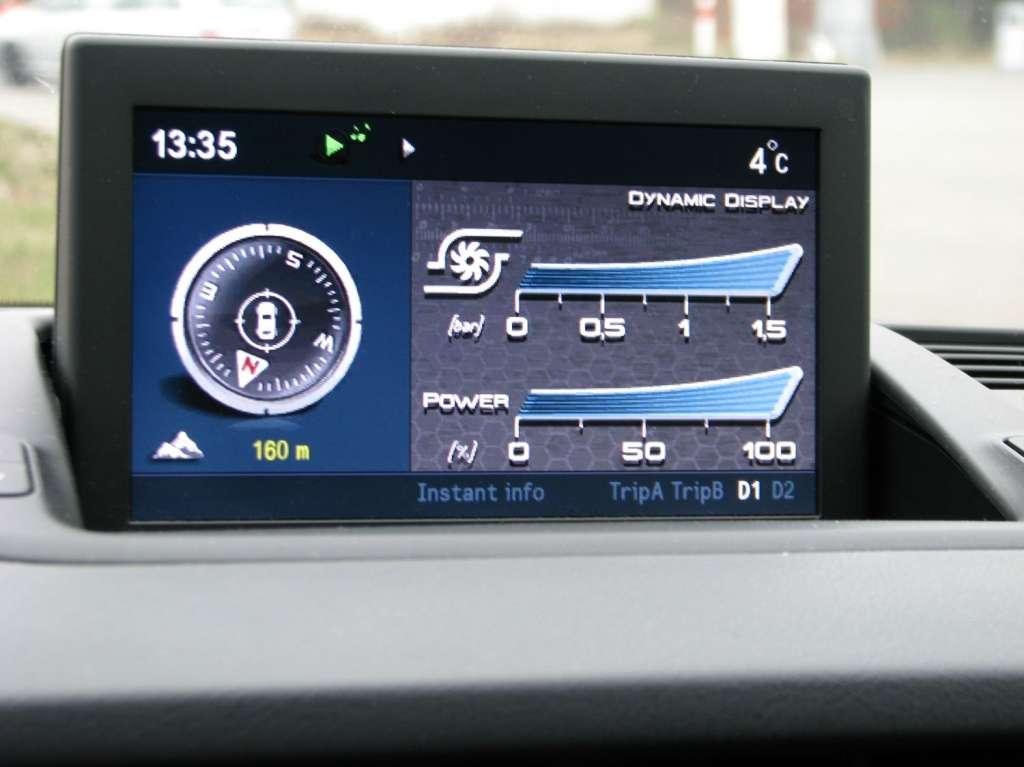 Po aktywowaniu trybu Dynamic na ekranie nawigacji pojawiają się graficzne przedstawienia ciśnienia doładowania i poziomu wykorzystania mocy, a można wybrać ekran prezentujący wartości przyspieszenia wzdłużnego i bocznego.