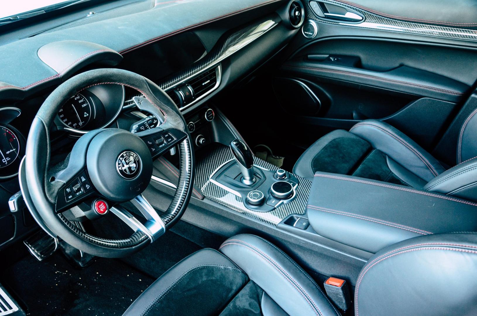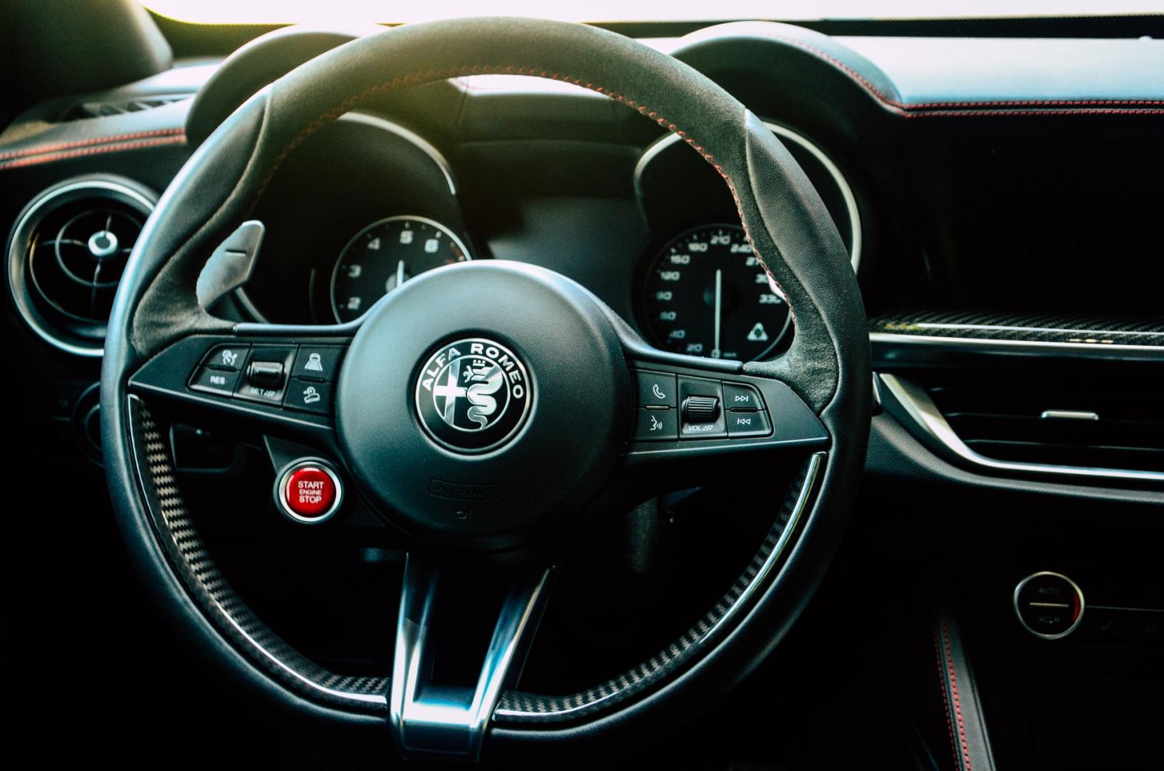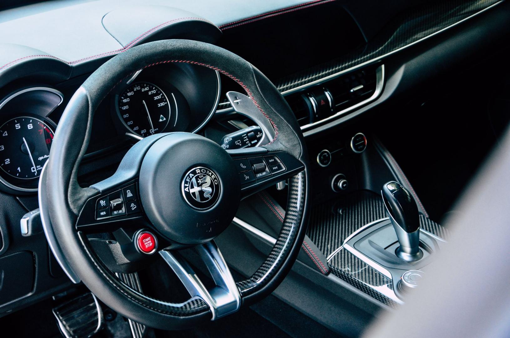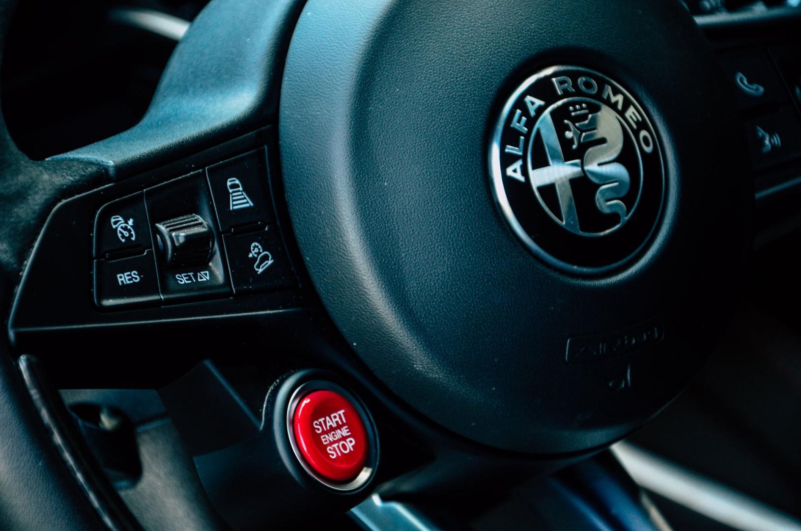 To przede wszystkim kubełkowe fotele, które nieźle trzymają w zakrętach. Jest tu parę dodatków z włókna węglowego, mamy skórę z czerwonymi przeszyciami i alcantarę. Kierownicę z przyciskiem startera również znamy już Giulii. Właściciele powinni być zadowoleni, bo dokładnie ten sam przycisk znajdziemy na… kierownicach Ferrari!