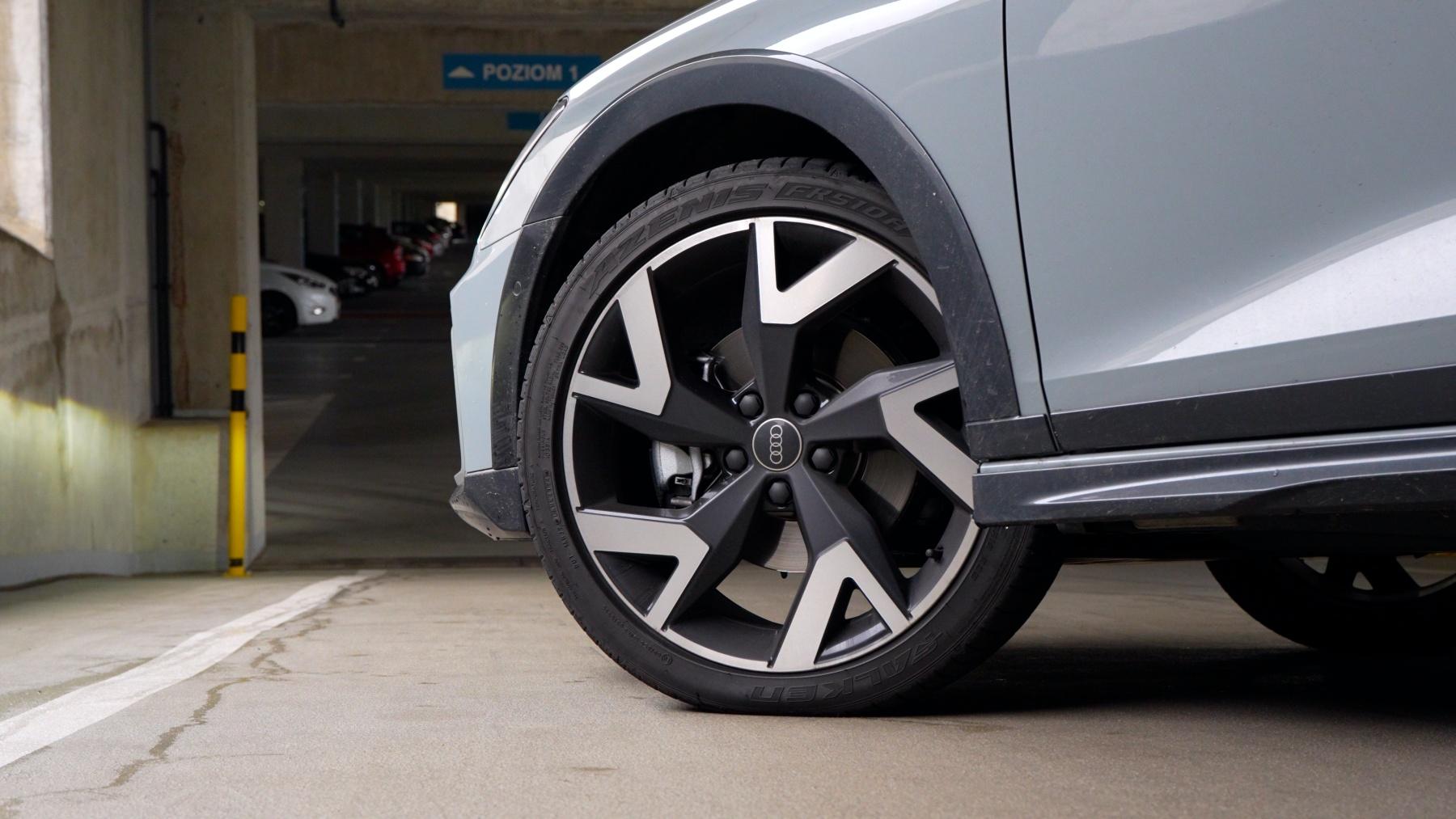 Nim zajrzymy do kabiny, pochylę się jeszcze nad specyfikacją tego konkretnego egzemplarza. Otóż samochód posiada opcjonalny szary lakier Arrow perłowy (3750 zł), który prezentuje się całkiem ładnie i pasuje do czarnych dodatków i opcjonalnych 19-calowych felg Audi Sport z ramionami w kształcie litery V i oponami 225/40. Takie koła trochę kłócą się z outdoorowym stylem wersji Allstreet, ale z drugiej strony zwykło się mówić, że przeciwieństwa się przyciągają.