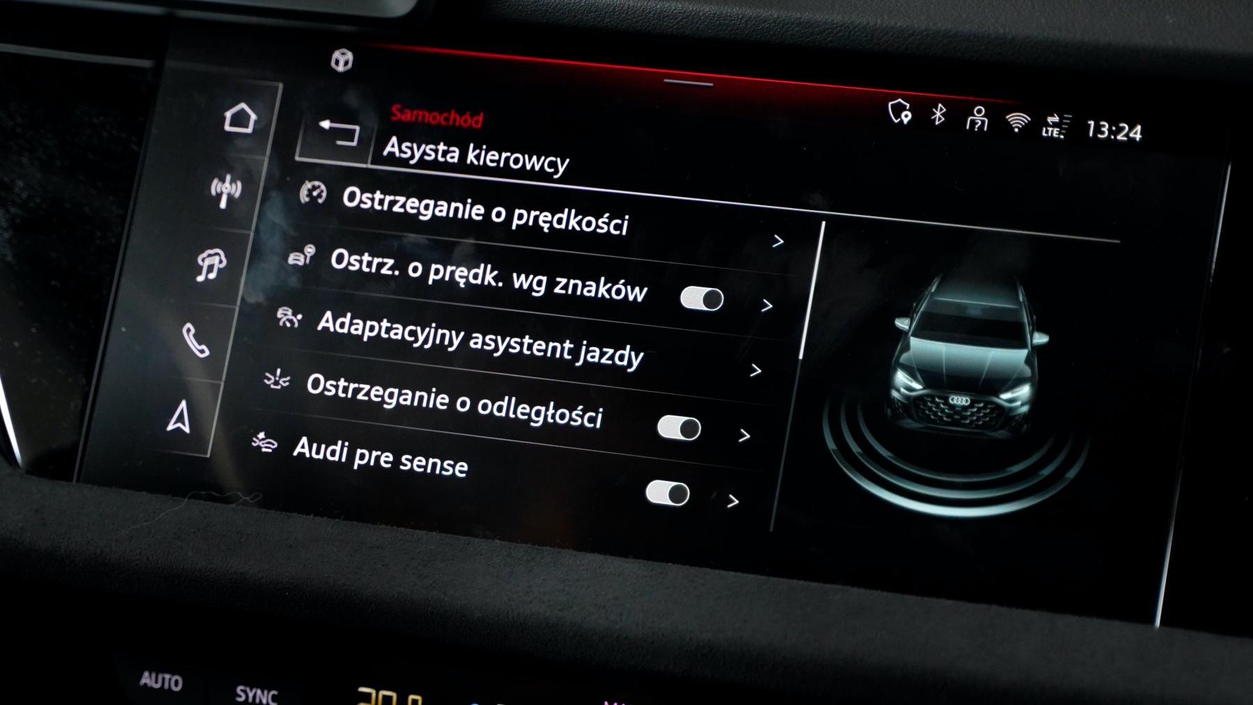 - Pakiet systemów wspomagających podczas jazdy i parkowania pro oraz pakiet systemów ochronnych i ostrzegawczych plus: adaptacyjny asystent jazdy z Emergency Assist i funkcją wspierającą przy zmianie pasa ruchu, adaptacyjny asystent prędkości z przewidującą regulacją prędkości, system rozpoznawania znaków drogowych współpracujący z kamerą, asystent parkowania z Audi parking system plus (czujniki parkowania przód i tył), kamera cofania, funkcję ostrzegającą przy zmianie pasa ruchu wraz z ostrzeżeniem przy wysiadaniu i asystentem ruchu przecinającego tor jazdy z tyłu, asystenta omijania przeszkód i asystenta skrętu w lewo, Audi pre sense front oraz Audi pre sense basic i Audi pre sense rear