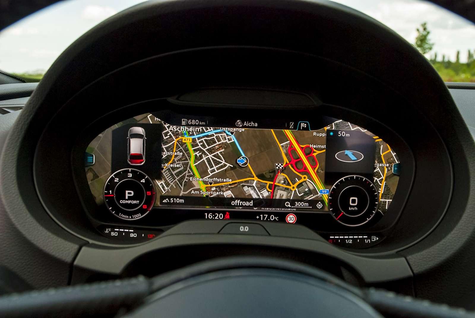 Poza znacznie rozbudowanymi systemami bezpieczeństwa, na pokładzie nowej A-trójki nie mogło również zabraknąć nowinek technologicznych. Mowa o Audi Virtual Cockpit, który po raz pierwszy w tym segmencie zastąpił konwencjonalną tablicę zegarów. Na ekranie o przekątnej aż 12,3 cala, kierowca może wybrać jeden z dwóch dostępnych widoków kokpitu. Pierwszy przypomina nieco tradycyjne analogowe zegary. W trybie Infotainment prędkościomierz i obrotomierz zmniejszają swoją średnicę i wędrują w dwa przeciwległe krańce ekranu, zwalniając środkową przestrzeń nawigacji lub innym opcjom (na przykład telefonu, radia czy systemu audio).